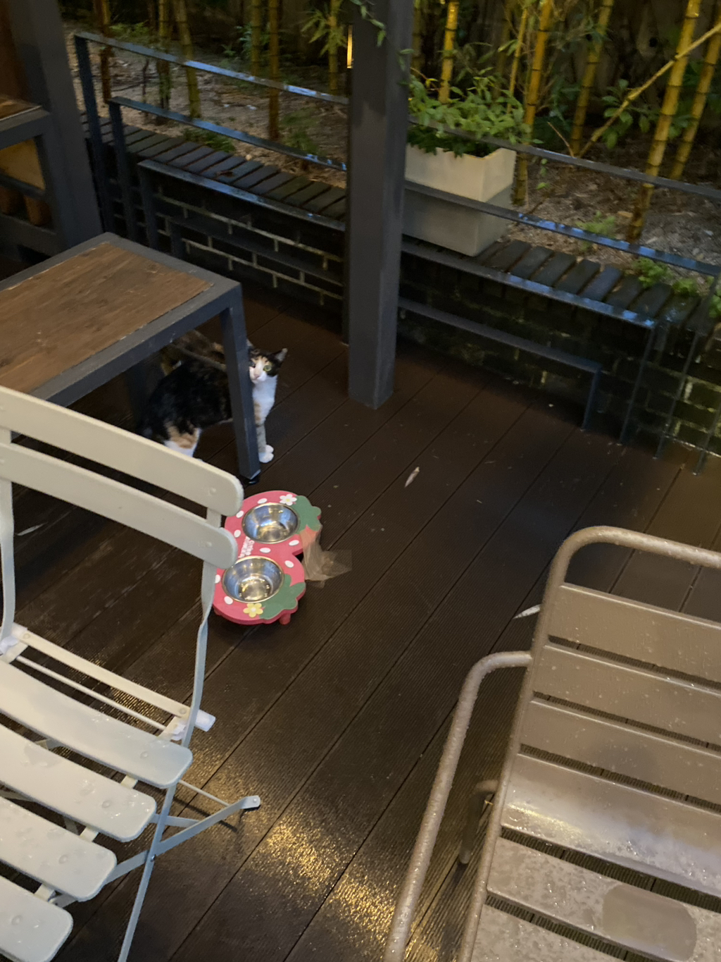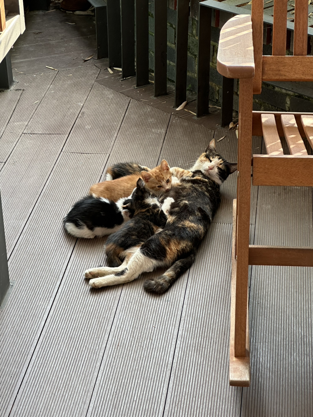새끼들을 데리고 가게 테라스에 나타난 어미냥이야
