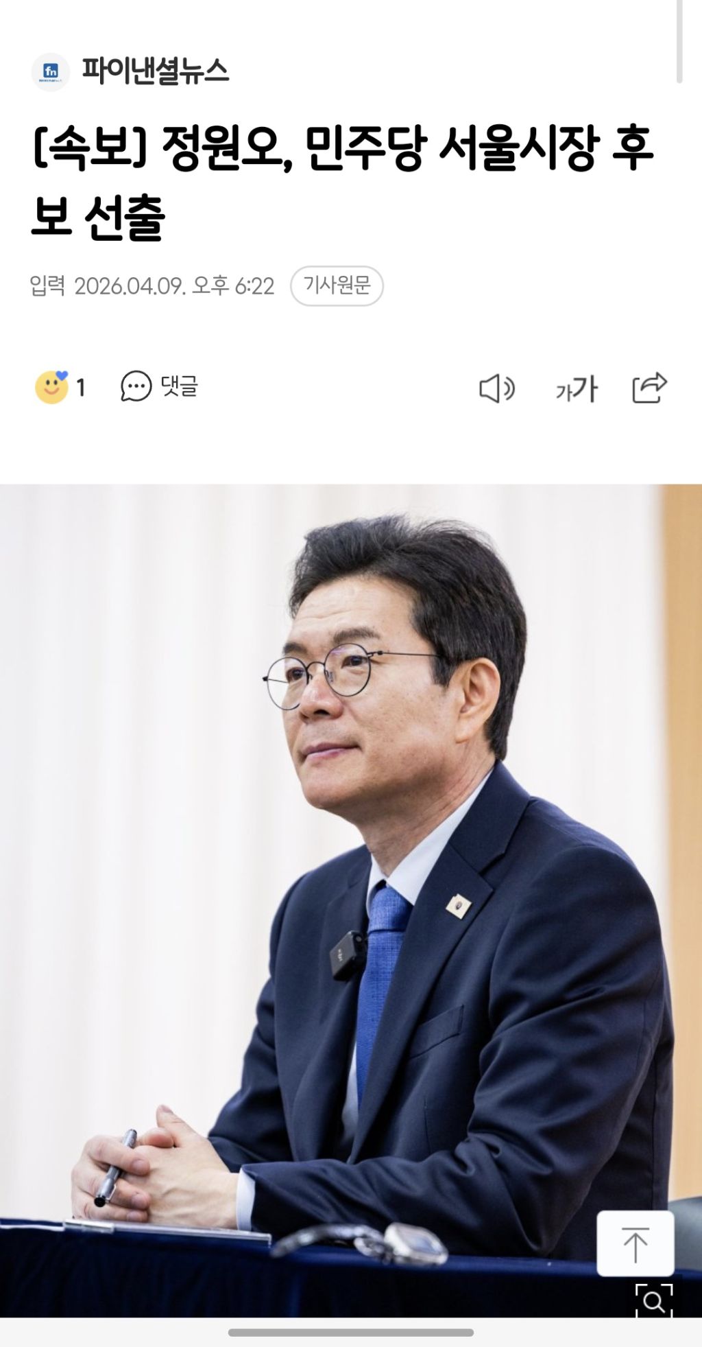 [여시뉴스데스크][속보] 정원오, 민주당 서울시장 후보 선출 작성자팥죽두그릇|작성시간26.04.09|조회수18,973 목록 댓글 335 글자크기 작게가 글자크기 크게가 출처: https://n.news.naver.com/article/014/0005505392?sid=004[속보] 정원오, 민주당 서울시장 후보 선출더불어민주당 선거관리위원회는 9일 서울시장 후보로 정원오 전 성동구청장을 선출했다고 밝혔다.n.news.naver.com과반 득표로 결선없이 바로 선출 다음검색 현재 게시글 추가 기능 열기 북마크 공유하기 신고 센터로 신고 댓글 댓글 335 댓글쓰기 답글쓰기 댓글 리스트 작성자양정원 | 작성시간 26.04.10 내가 뽑았어 ^.^ 작성자둥실폼 | 작성시간 26.04.10 가보자고 작성자늠꺅 | 작성시간 26.04.10 뽑는다 작성자변기에얼굴을넣어보세요 | 작성시간 26.04.10 가든파이브 레츠고 작성자안은진 | 작성시간 26.04.13 가든파이브 보내줄게•• 댓글 전체보기