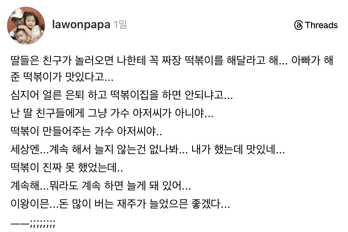 [스크랩] [흥미돋]홍경민 의외의 근황..thread 작성자계절 틈에 잠시 피는 낯선꽃처럼|작성시간26.04.10|조회수23,239 목록 댓글 32 글자크기 작게가 글자크기 크게가 출처: 여성시대 정땅콩https://www.threads.com/@lawonpapa짜장떡볶이 마스터 다음검색 스크랩 원문 : *여성시대* 차분한 20대들의 알흠다운 공간 현재 게시글 추가 기능 열기 북마크 공유하기 신고 센터로 신고 댓글 댓글 32 댓글쓰기 답글쓰기 댓글 리스트 작성자룍시땅 | 작성시간 26.04.10 ㅋㅋㅋㅋㅋㅋㅋ 작성자솥뚜껑 | 작성시간 26.04.10 저 짤은 볼때마다 귀여워 (아저씨 말고 딸) 답댓글 작성자뿌쁄삐뽀언니 | 작성시간 26.04.10 저때 올라온 짤 너무 사랑스럽고 귀여워서 2갠가 3개 다 저장해서 지금도 갖고있어 ㅋㅋ 작성자Amoroso | 작성시간 26.04.10 왤케웃김 말하는재질ㅋㅋㅋㅋㅋㅋ 작성자대 아니고 데 | 작성시간 26.04.10 애기들 앞접시봐 ㅈㄴ귀여워 댓글 전체보기