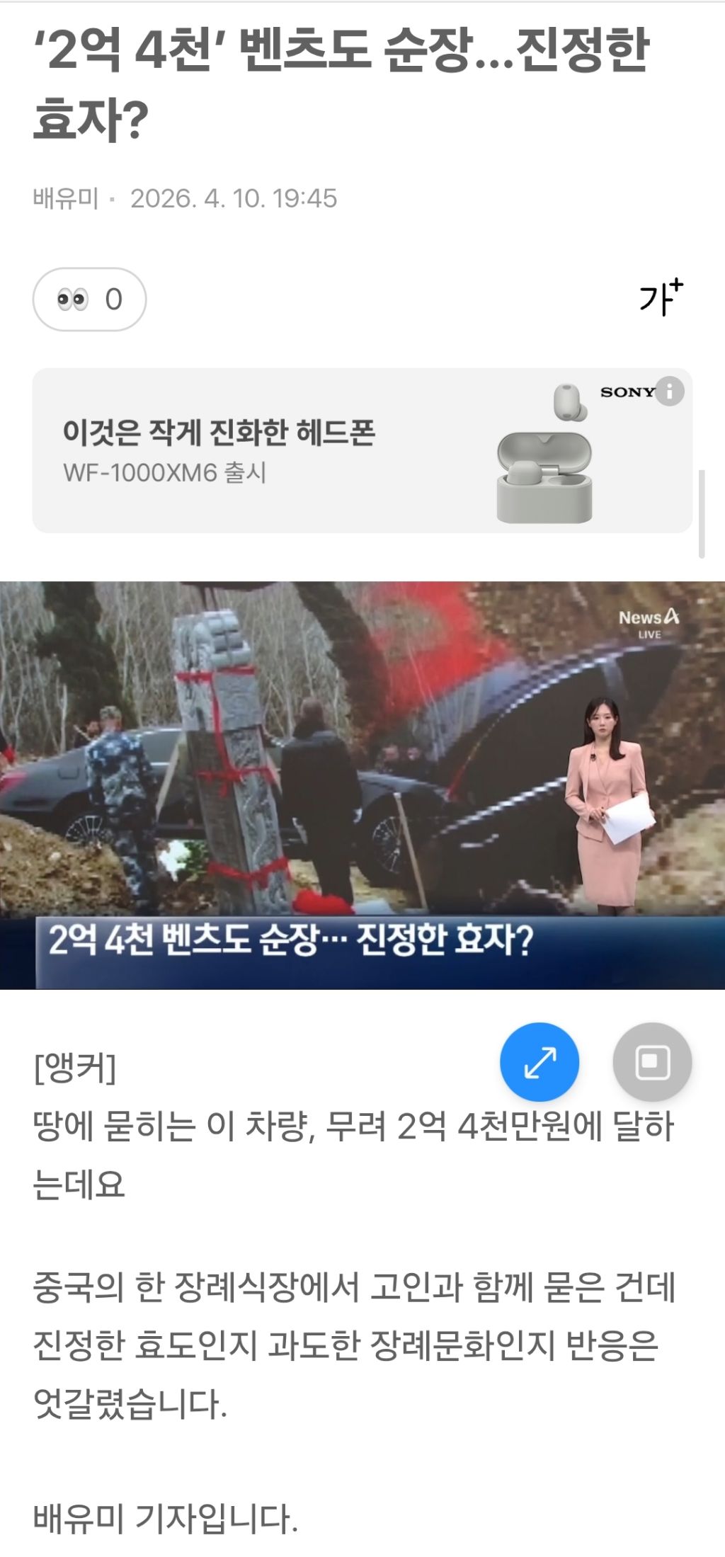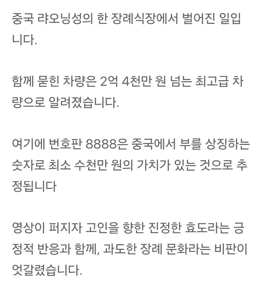[여시뉴스데스크]‘2억 4천’ 벤츠도 순장…진정한 효자? 작성자여단오여|작성시간26.04.10|조회수6,968 목록 댓글 14 글자크기 작게가 글자크기 크게가 출처: https://v.daum.net/v/20260410194503568‘2억 4천’ 벤츠도 순장…진정한 효자?[앵커] 땅에 묻히는 이 차량, 무려 2억 4천만원에 달하는데요 중국의 한 장례식장에서 고인과 함께 묻은 건데 진정한 효도인지 과도한 장례문화인지 반응은 엇갈렸습니다. 배유미 기자입니다. [v.daum.net 다음검색 현재 게시글 추가 기능 열기 북마크 공유하기 신고 센터로 신고 댓글 댓글 14 댓글쓰기 답글쓰기 댓글 리스트 작성자98년도에는요 | 작성시간 26.04.10 환경문제가 있지 않을끄 작성자다래달래 | 작성시간 26.04.10 파운데이션 장군말고 쟤를 잡아뭔 사치람 작성자육각형얼굴 | 작성시간 26.04.10 도굴하러갈 여시구함 작성자삐리빠라뽀뽀뽀 | 작성시간 26.04.10 쓰레기불법매립ㅋㅋㅋㅋㅋㅋ 작성자신라면 | 작성시간 26.04.10 사람들 생각하늠거 다 비슷하구만ㅋㅋㅋ 댓글 전체보기