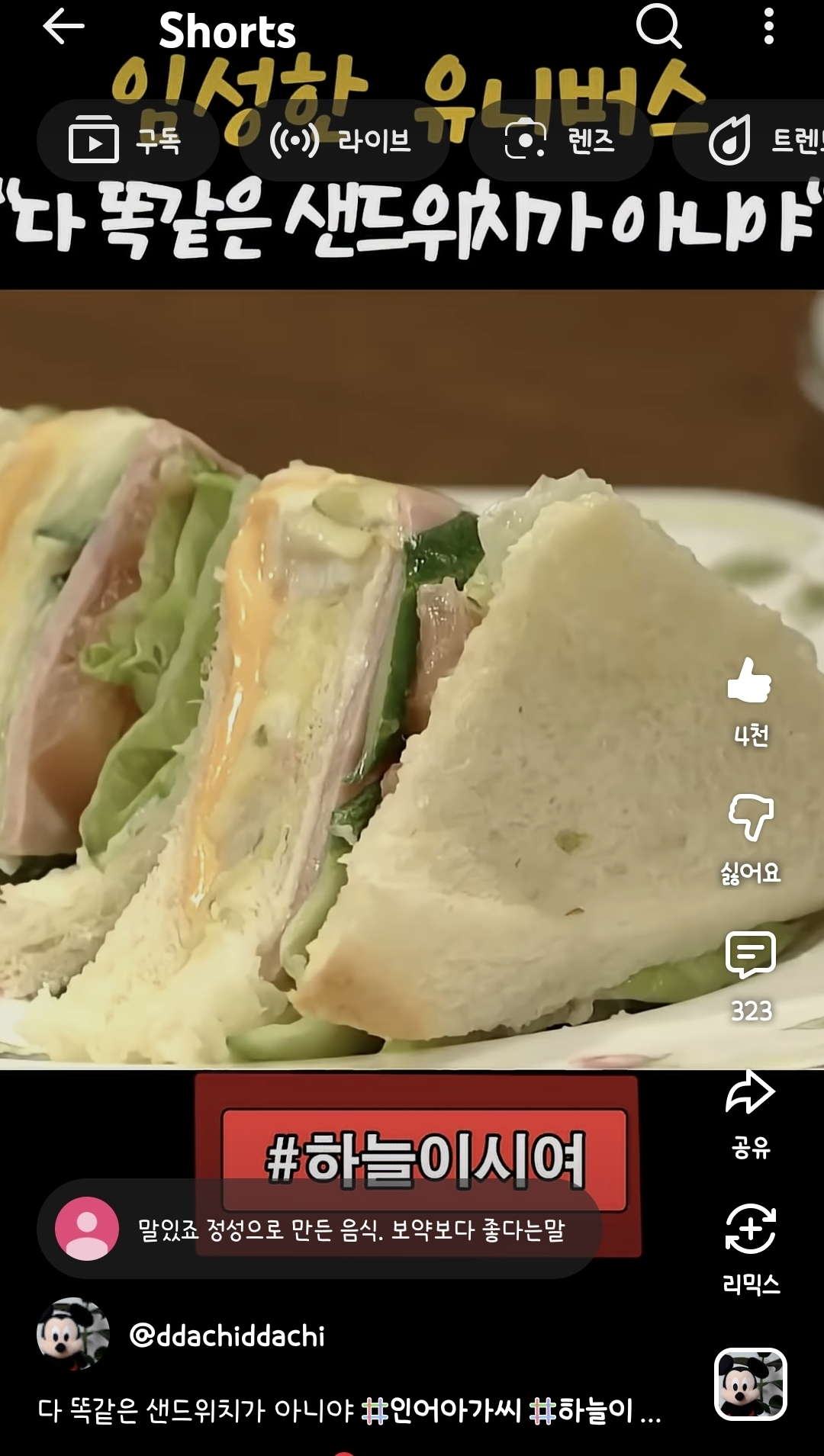 인어아가씨 아리영은 과외알바하던 학생집에서 간식으로 나온 샌드위치 엄마갖다준 추억이 있는 음식