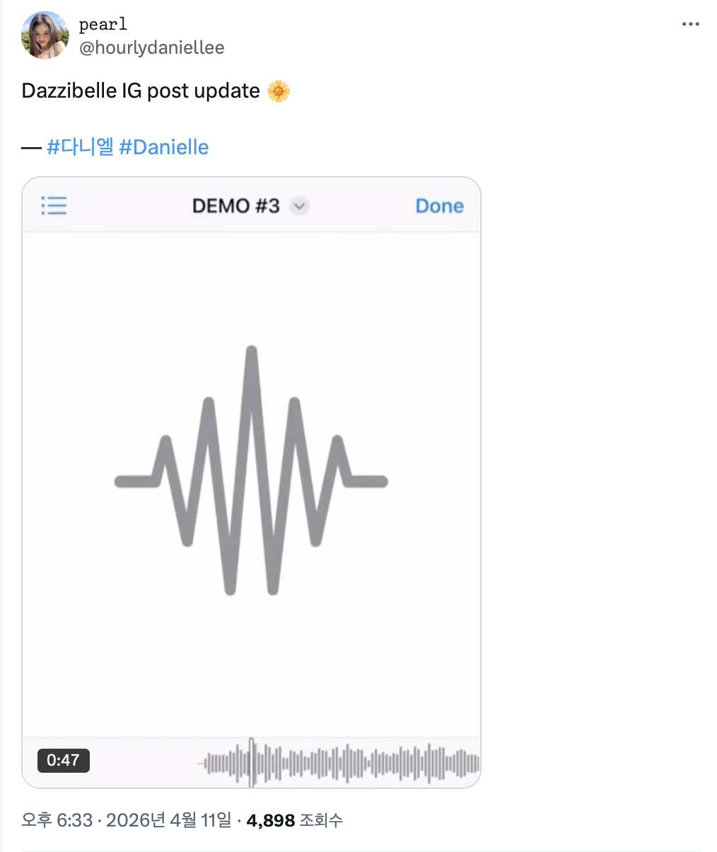[흥미돋]다니엘 인스타그램 업데이트 (데모곡 공개) 작성자okido|작성시간26.04.11|조회수115,977 목록 댓글 205 글자크기 작게가 글자크기 크게가 출처: https://www.instagram.com/p/DW_IOjiEQ-O/ 누르면트윗으로이동 다음검색 현재 게시글 추가 기능 열기 북마크 공유하기 신고 센터로 신고 댓글 댓글 205 댓글쓰기 답글쓰기 댓글 리스트 작성자천운이따르는자 | 작성시간 26.04.12 노래 쏘굿 작성자이지금이야수 | 작성시간 26.04.12 ㅜㅜㅜㅜ 너무 좋다 작성자티커벨 | 작성시간 26.04.12 와 노래 진심 너무 좋아 작성자시나몬모카 | 작성시간 26.04.12 헐 너무좋아 작성자미스트시원래 | 작성시간 26.04.16 왜케 Suno ai 로 만든 노래같지 댓글 전체보기