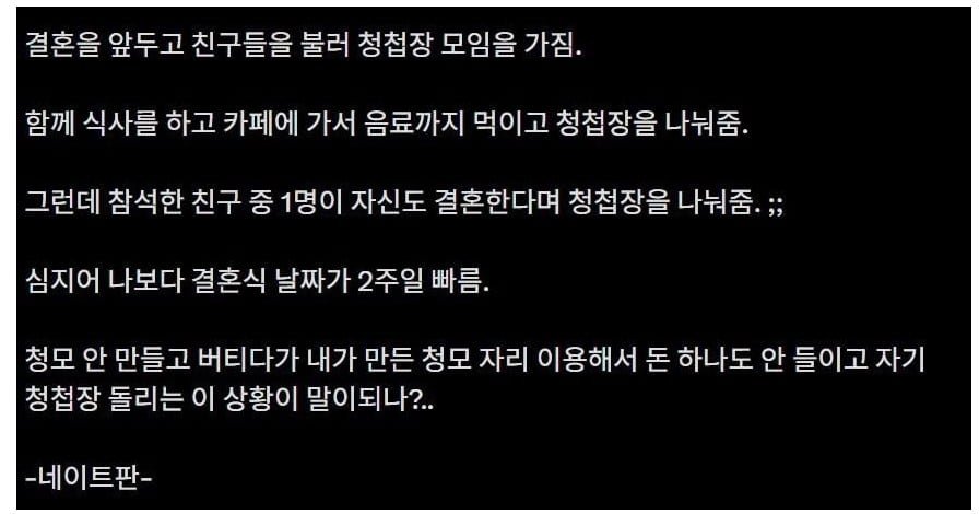 [스크랩] [흥미돋]결혼식 앞두고 청첩장 모임에서 벌어진 일.jpg 작성자flflf|작성시간26.04.12|조회수65,155 목록 댓글 48 글자크기 작게가 글자크기 크게가 다음검색 스크랩 원문 : 도탁스 (DOTAX) 현재 게시글 추가 기능 열기 북마크 공유하기 신고 센터로 신고 댓글 댓글 48 댓글쓰기 답글쓰기 댓글 리스트 작성자종로서적 | 작성시간 26.04.13 와 거지. 나같음 넌 나중에 모임 만들어서 줘 라고 했을듯; 작성자알밤크림빵 | 작성시간 26.04.14 인간 뻐꾸기노 작성자벌그들 | 작성시간 26.04.14 와 양아치거지 작성자파프리카 청춘이다 | 작성시간 26.04.21 근데 저러면 청모 애들이 안가지않겠슨 작성자노으을 | 작성시간 06:44 new 엥 그럼안되지 밥 같이 사든가 댓글 전체보기