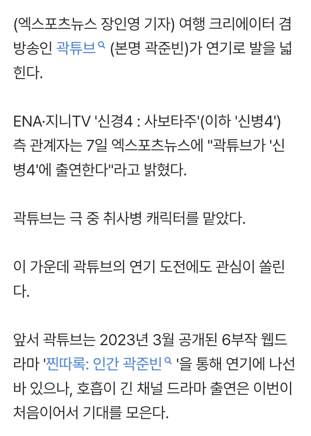 [흥미돋]곽튜브, 子 출산 이어 겹경사…"'신병4' 출연 확정" 배우로 영역 확장 작성자빛나핑|작성시간26.04.13|조회수4,964 목록 댓글 64 글자크기 작게가 글자크기 크게가 출처: 여성시대 빛나핑https://naver.me/5eDGzaIy[공식] 곽튜브, 子 출산 이어 겹경사…"'신병4' 출연 확정" 배우로 영역 확장여기를 눌러 링크를 확인하세요link.naver.com빛나리랑 캐릭터 겹치지 않나6일전 기사라 말멀 흥미돋으로 다음검색 현재 게시글 추가 기능 열기 북마크 공유하기 신고 센터로 신고 댓글 댓글 64 댓글쓰기 답글쓰기 댓글 리스트 작성자녹차라떼에샷추가요 | 작성시간 26.04.13 ㅋ 작성자항도니낮잠 | 작성시간 26.04.13 아 ... 작성자모여봐요 동물의숲 | 작성시간 26.04.13 아 신병 애청자였는데.....ㅅㅂ 재뿌리나 작성자뭉게뭉게란 | 작성시간 26.04.13 왜그러는거야 진짜? 작성자꿀서 | 작성시간 26.04.14 ?? 댓글 전체보기