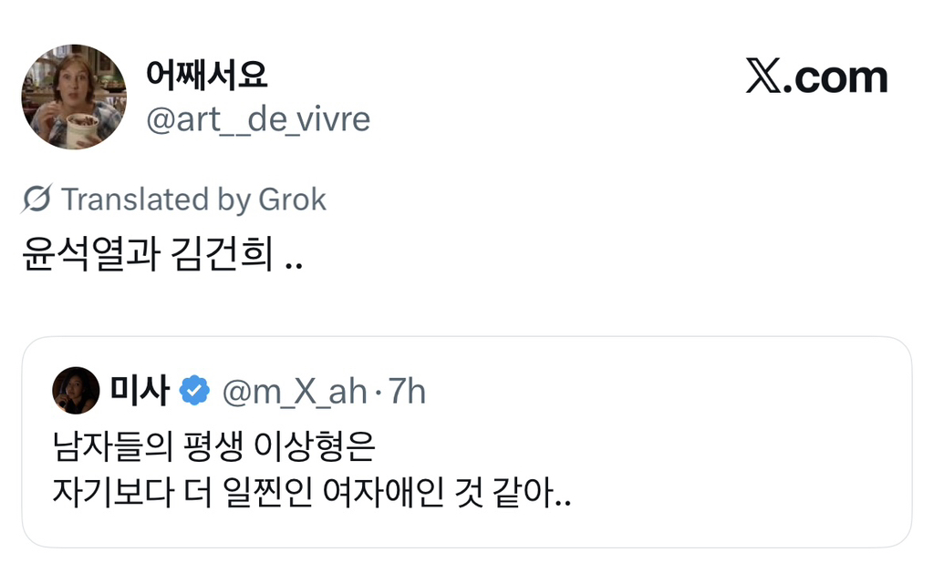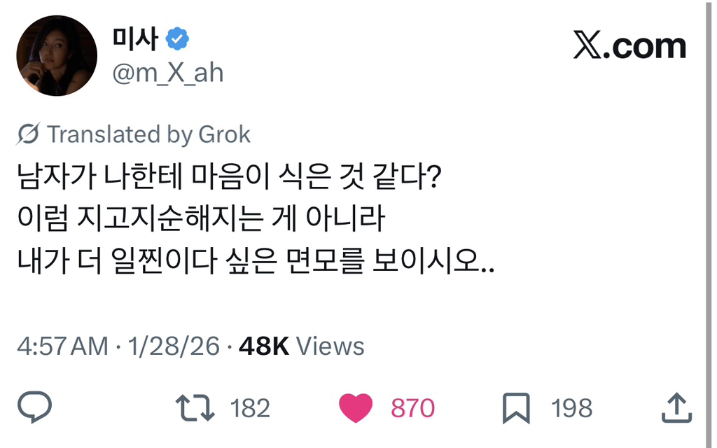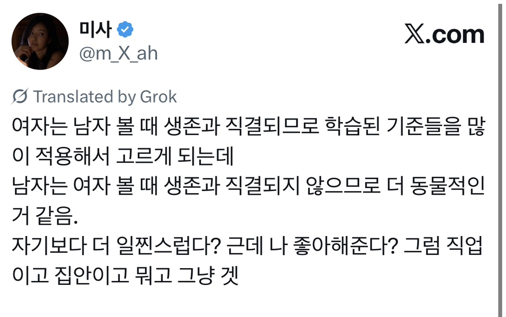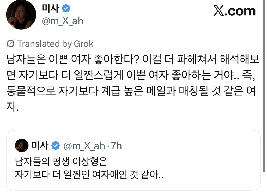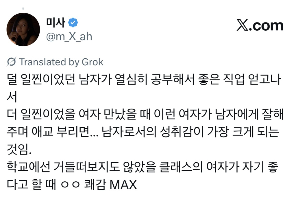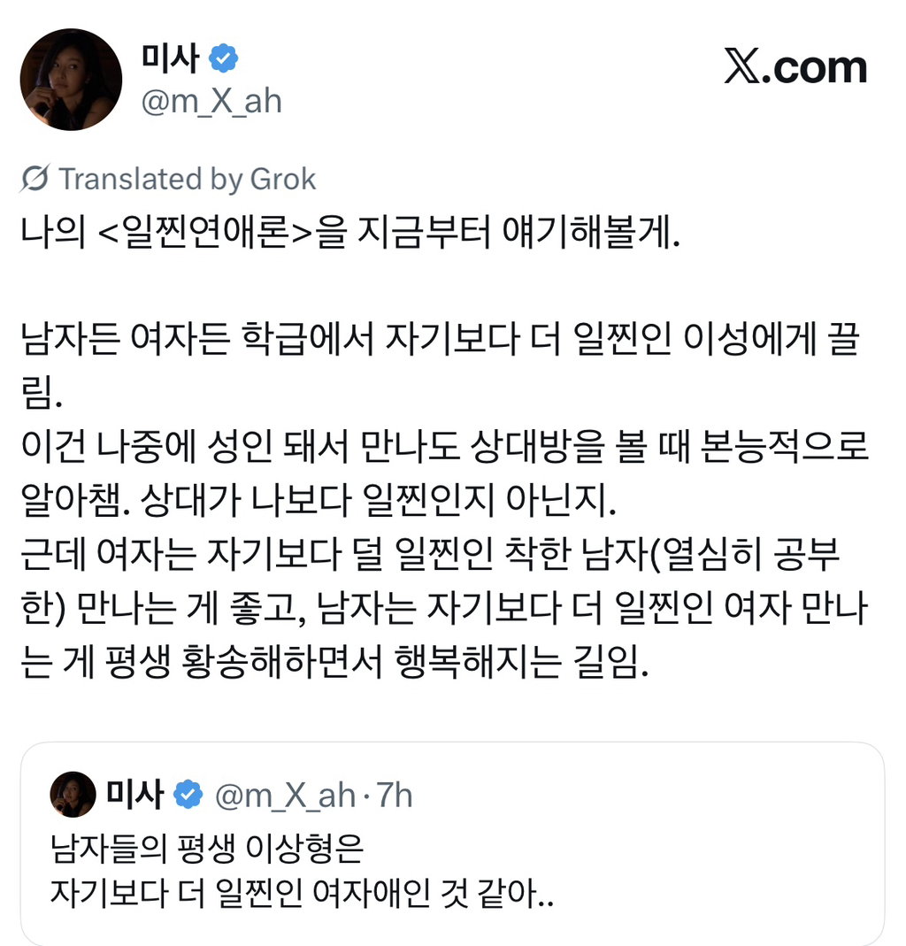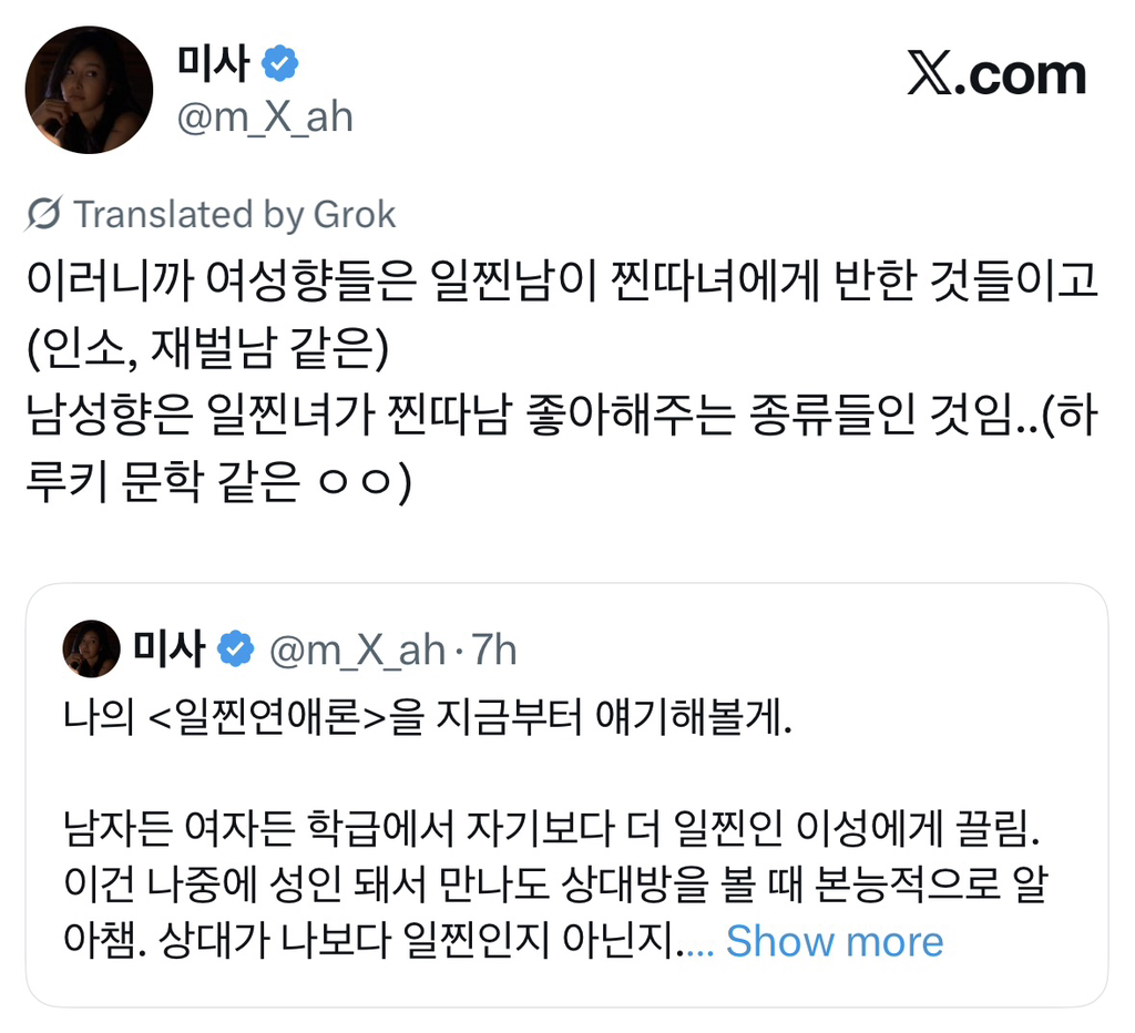 [스크랩] [흥미돋]남자들의 평생 이상형은 자기보다 더 일찐인 여자애인 것 같아..X 작성자민미미|작성시간26.04.14|조회수17,972 목록 댓글 59 글자크기 작게가 글자크기 크게가 출처: https://x.com/m_x_ah/status/2016454210163028457?s=46 다음검색 스크랩 원문 : *여성시대* 차분한 20대들의 알흠다운 공간 현재 게시글 추가 기능 열기 북마크 공유하기 신고 센터로 신고 댓글 댓글 59 댓글쓰기 답글쓰기 댓글 리스트 작성자남남수수학학원원장장남남남국 | 작성시간 26.04.14 윤건희때문엨ㅋㅋㅋㅋㅋㅋㅋㅋㅋㅋㅋㅋㅋㅋㅋㅋㅋㅋㅋㅋㅋㅋㅋㅋㅋ 작성자딩푸딩푸딩 | 작성시간 26.04.14 오.. 생존 직결 유무 뭔가 굉장히 설득력있다 작성자멋져나는 | 작성시간 26.04.14 옛날 소설에도 새침한 이쁜 여학생이 코찔찔 남자애랑 썸두는거 많자나 작성자세인트 엑소시스트 | 작성시간 26.04.14 마지막 때문에 다 까먹었어 ㅋㅋㅋㅋㅋ 작성자월릉 | 작성시간 26.04.14 ㅋㅋㅋㅋㅋ아 ㅅㅂ개터짐 댓글 전체보기