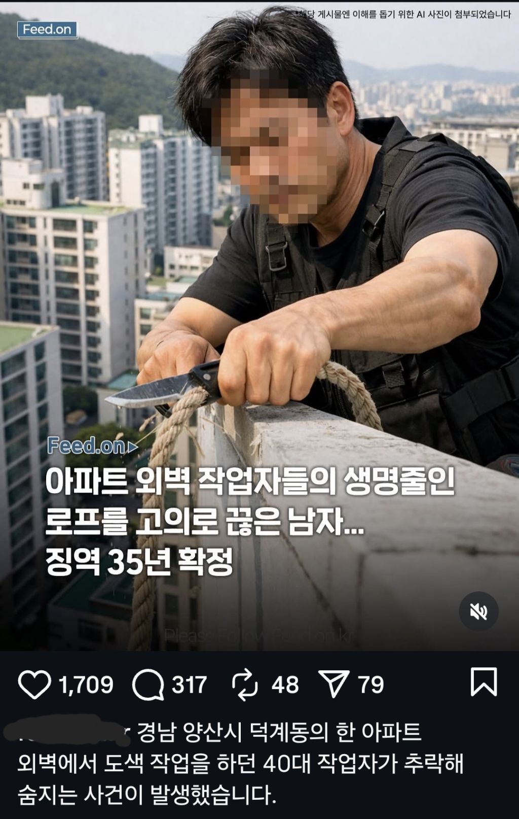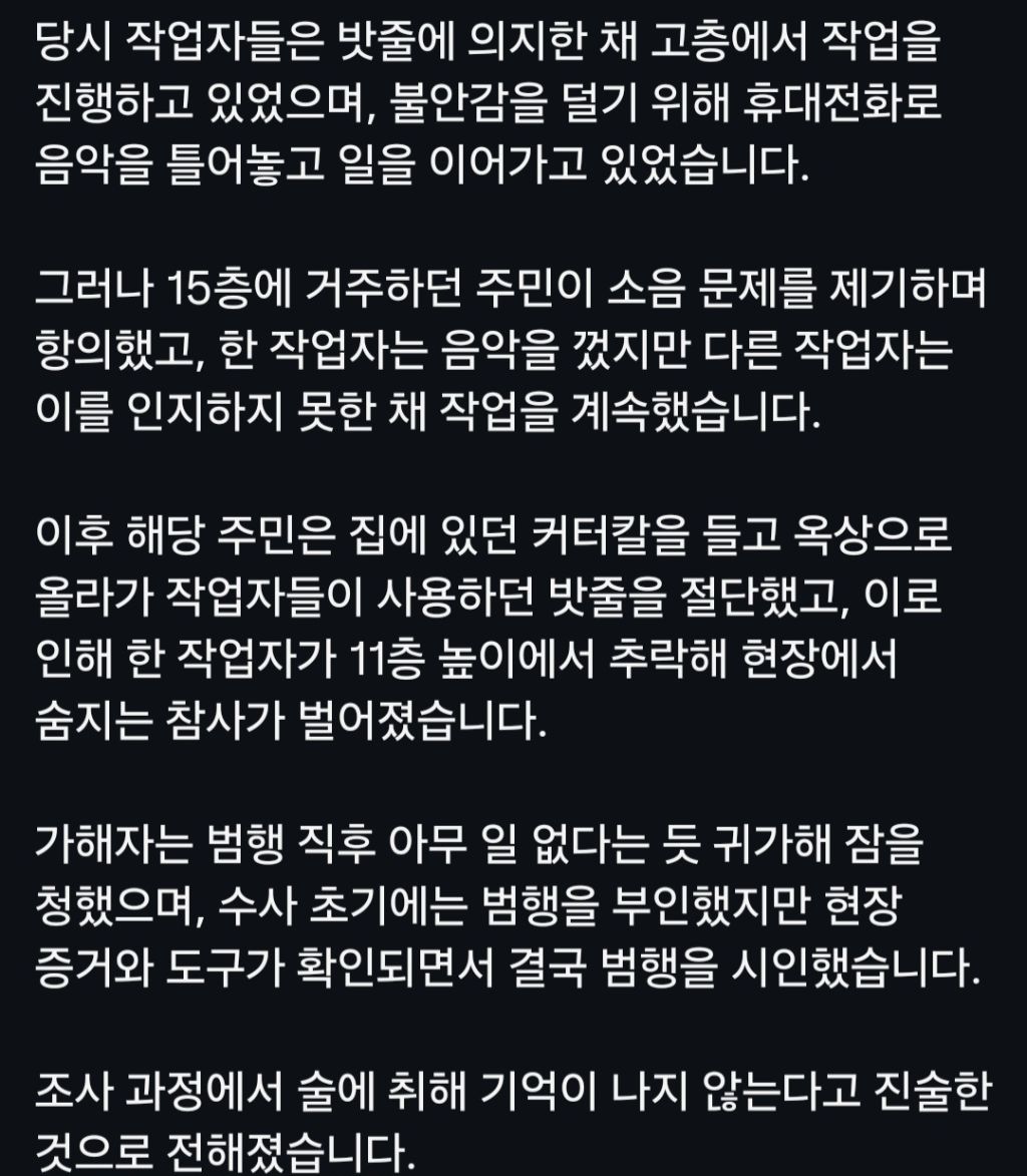 [기타]아파트 외벽 작업자들 밧줄 끊은 남자 작성자ㅋㅇㄹㄹ|작성시간26.04.14|조회수10,406 목록 댓글 65 글자크기 작게가 글자크기 크게가 출처: 여성시대 (ㅋㅇㄹㄹ) 다음검색 현재 게시글 추가 기능 열기 북마크 공유하기 신고 센터로 신고 댓글 댓글 65 댓글쓰기 답글쓰기 댓글 리스트 작성자난딩 | 작성시간 26.04.14 미친새끼아니야? ..... 작성자레몬라임비터스 | 작성시간 26.04.14 성장 환경 어쩌라고 감형해줌?? 성장 환경 불우하면 다 살인자 되는 줄 아나 작성자웃으며 안녕 | 작성시간 26.04.14 판새야 작성자로키와사는여자 | 작성시간 26.04.14 미친놈 작성자그만뭐라해 | 작성시간 26.04.14 아니 씨발 자라온 환경이고 자시고 술 처마신 건 또 언제까지 감형 사유로 참작해 줄건데 댓글 전체보기