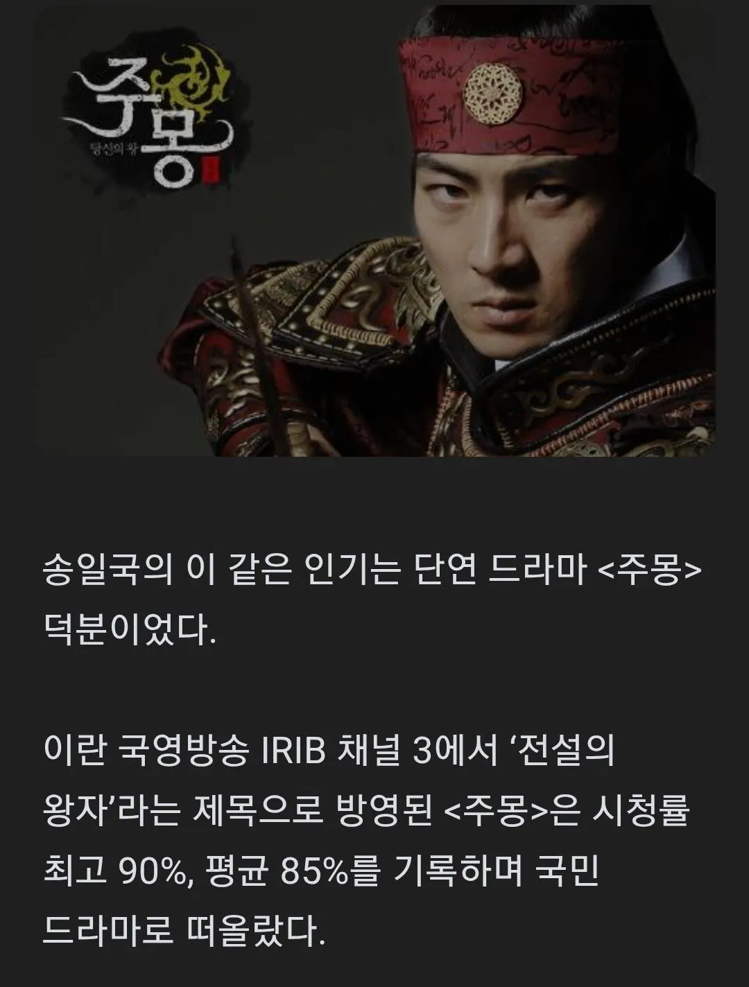 작성자핫샌드위치 작성시간 26.04.14 어떤 코드가 그렇게 통했을까? 주몽 재밌긴 했는데 저정도로 온 국가가 다른나라 사극을 좋아하려면 뭔가 코드가 맞아떨어진게 있을듯