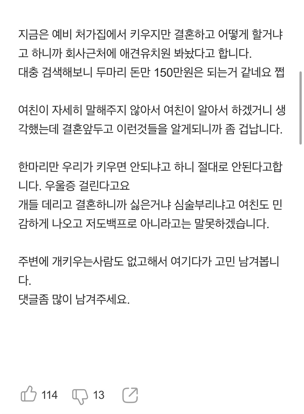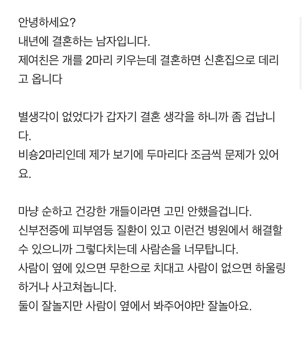 작성자꿈꾸는고양이 작성시간 26.04.15 반려동물에 대한 가치관 안맞는데 결혼하면 큰일남..