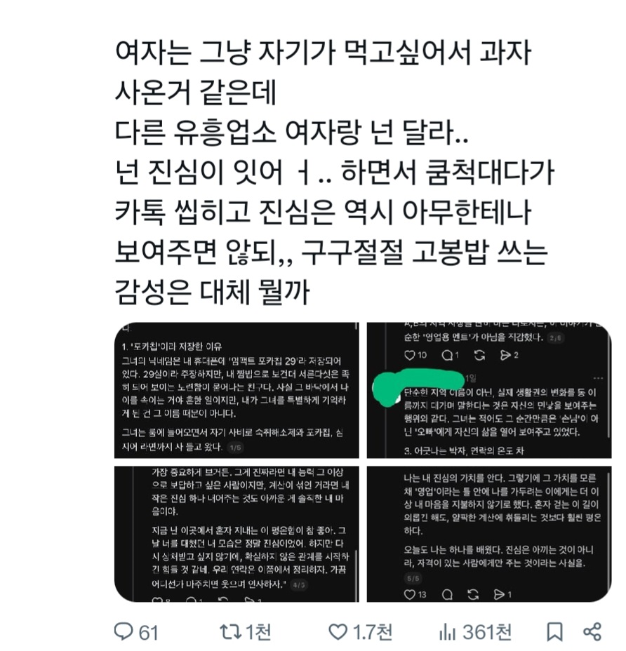 [흥미돋]술집여자한테 반해서 혼자 북치고 장구치는 쓰레드 아저씨 작성자표고벗어|작성시간26.04.15|조회수36,352 목록 댓글 248 글자크기 작게가 글자크기 크게가 출처: https://x.com/i/status/2043960919622070322우웩 🤮 혼자 왜저래 다음검색 현재 게시글 추가 기능 열기 북마크 공유하기 신고 센터로 신고 댓글 댓글 248 댓글쓰기 답글쓰기 댓글 리스트 작성자뭐래는겨 | 작성시간 26.04.16 개병신새끼 ㅋㅋㅋㅋㅋㅋㅋㅋㅋㅋㅋㅋㅋㅋㅋ 작성자Lamborghini | 작성시간 26.04.16 노래방보도 : 아 출출하노~ 작성자느ㅣ개비최종학력리박스쿨 | 작성시간 26.04.16 아니 뭐 아무것도 안해줬는데 포카칩 하나에 구구절절....... 이쯤에서 그만하자 이지랄 ㅋㅋㅋㅋㅋㅋㅋㅋㅋㅋㅋㅋㅋ 작성자천상연 미친 정신병자야 널 사랑해 | 작성시간 26.04.16 염병하고 앉았네; 작성자낭낭낭반지 | 작성시간 26.04.17 우욱 댓글 전체보기