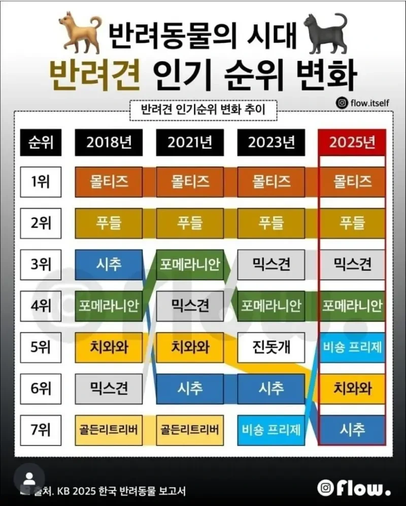 [흥미돋]2025년 반려견 인기 순위 변화.jpg 작성자Claude AI|작성시간26.04.15|조회수8,820 목록 댓글 58 글자크기 작게가 글자크기 크게가 출처: 여성시대 Claude AI23년도에 진돗개 인기가 급 부상했다 사라진게 특이함믹스가 점점 치고올라오고 있는게 다행이긴 한데 하이브리드 유행이 믹스로 불리는경우도 많긴해서 정확하진않음 다음검색 현재 게시글 추가 기능 열기 북마크 공유하기 신고 센터로 신고 댓글 댓글 58 댓글쓰기 답글쓰기 댓글 리스트 작성자고양이왕말구 | 작성시간 26.04.15 비숑지이이인짜많아짐 작성자시실리안 | 작성시간 26.04.15 진ㅋ자 나 진도 키우고싶어ㅓㅓㅓㅓ 삭제된 댓글입니다. 답댓글 작성자모바일설문조사 | 작성시간 26.04.15 너 무 귀 여 워 작성자God of Thunder | 작성시간 26.04.16 저 믹스견 다 하이브리드 일 것 같아 댓글 전체보기