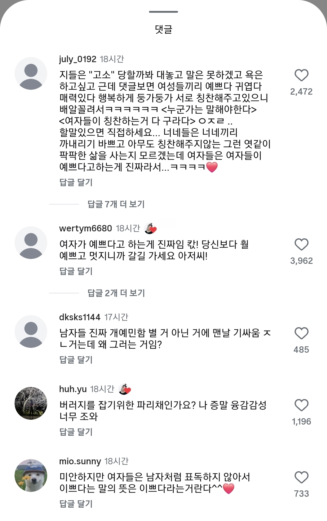 근데 뭘 거기서 굳이굳이 왜 예쁘다고 하냐고 여자들은 왜 구래?하는 한남들 진짜 이해못하겠음 그냥 받어들이라고 뭘 비비꼬아서 생각하냐 -