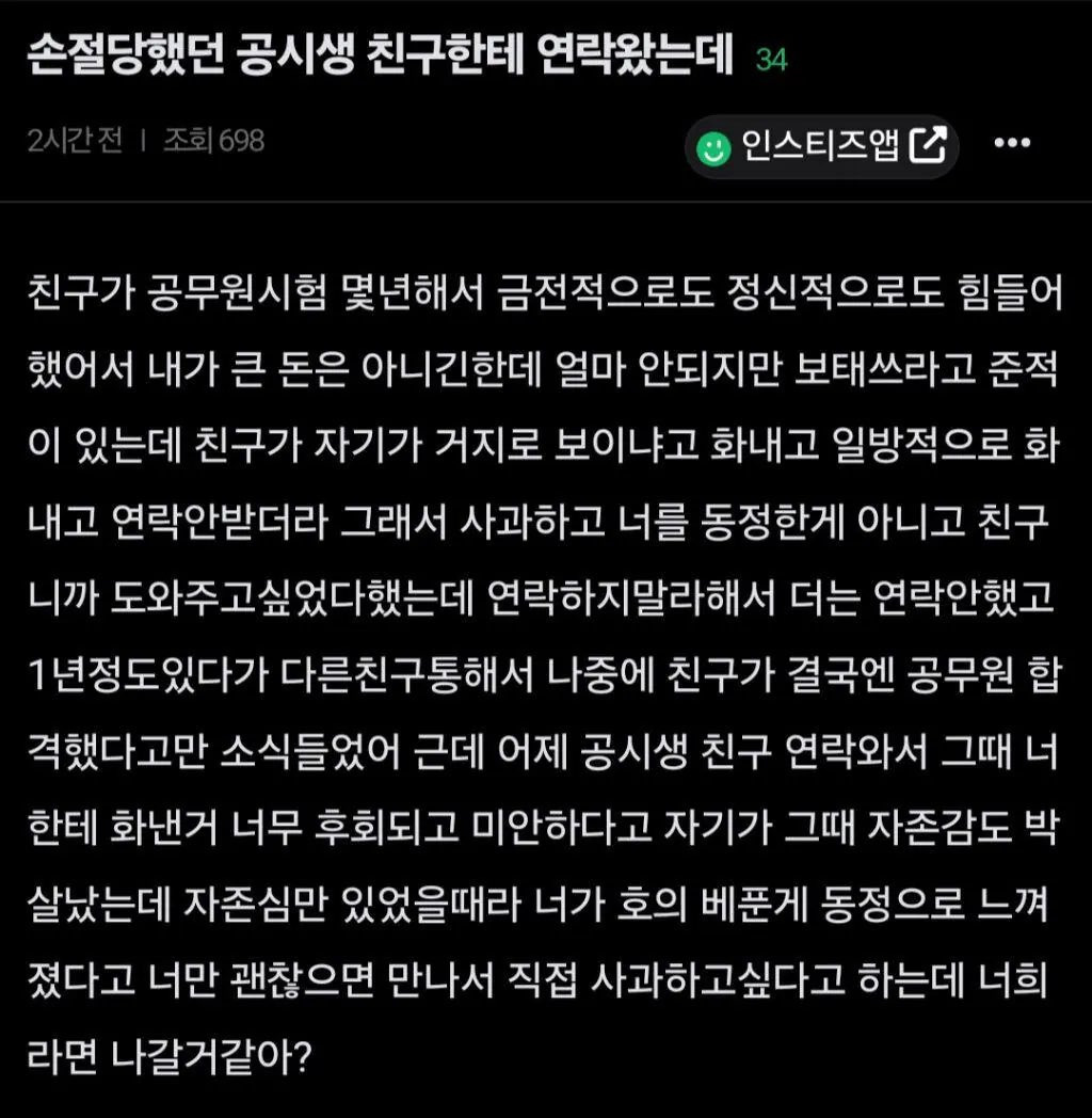 [흥미돋]손절당한 공시생 친구에게 온 연락.instz 작성자덩기덕쿵더러러러|작성시간26.04.26|조회수49,094 목록 댓글 984 글자크기 작게가 글자크기 크게가 출처: https://x.com/mad_dogdebt/status/2048174883365171437 여시들이라면 나갈 거 같은지 궁금해서 가져와봄 다음검색 현재 게시글 추가 기능 열기 북마크 공유하기 신고 센터로 신고 댓글 댓글 984 댓글쓰기 답글쓰기 댓글 리스트 작성자플루아 | 작성시간 26.04.27 만남 작성자강헴주인 | 작성시간 26.04.27 만남 작성자드림라이더 | 작성시간 26.04.27 만나서 사과는 받을듯 그치만 예전만큼 좋아하는 친구가 될지는 잘 모르겠어 작성자출근극혐 | 작성시간 26.04.27 나가야지 내가 그렇게 생각해줄 정도로 좋은 친구였는데 친구도 잘못을 인정하고 사과를 하갰다는 것도 난 진짜 용기라고 봐 작성자개같으시다 | 작성시간 26.04.28 new 이건 걍 시기에따라 다를듯 지금은 현생 바쁜시기라 안만남 댓글 전체보기