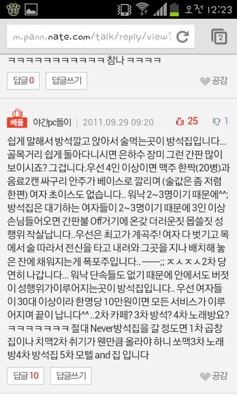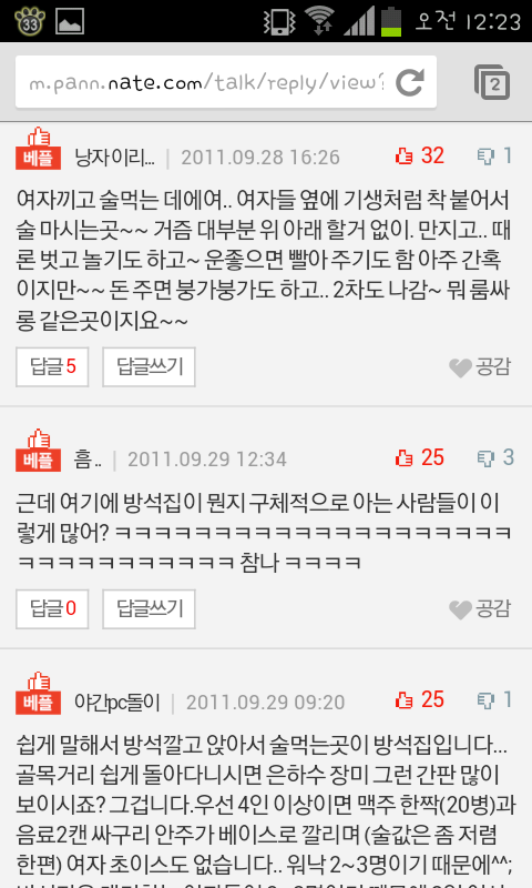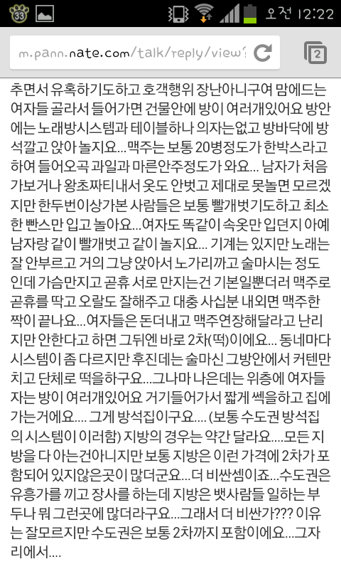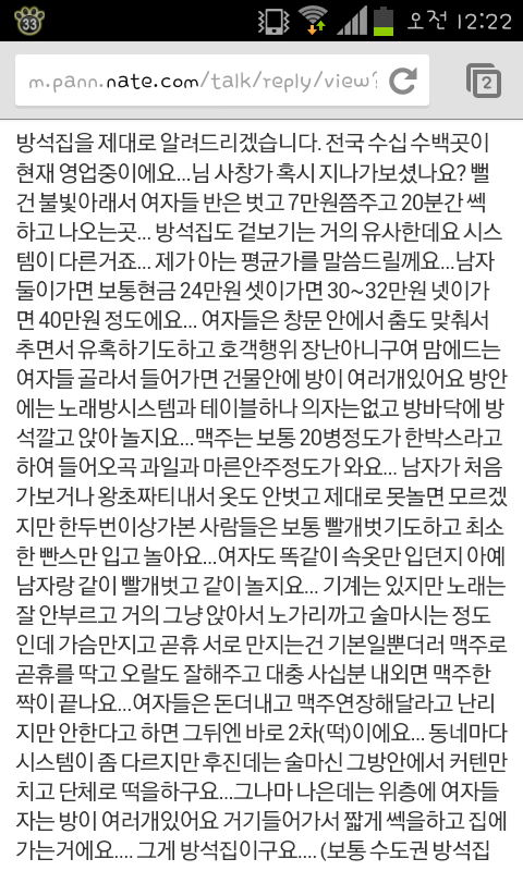 작성자한걸음뒤에항상 작성시간 14.02.16 남친한테 룸싸롱이랑 방석집이랑 다를게뭐냐고 물어봤더니.. 더싸게 노는대신 여자급이 더 낮다고 정의하던데..