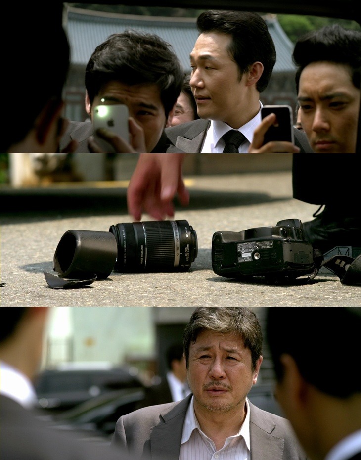 누군가 산산조각난 카메라를 주워들며