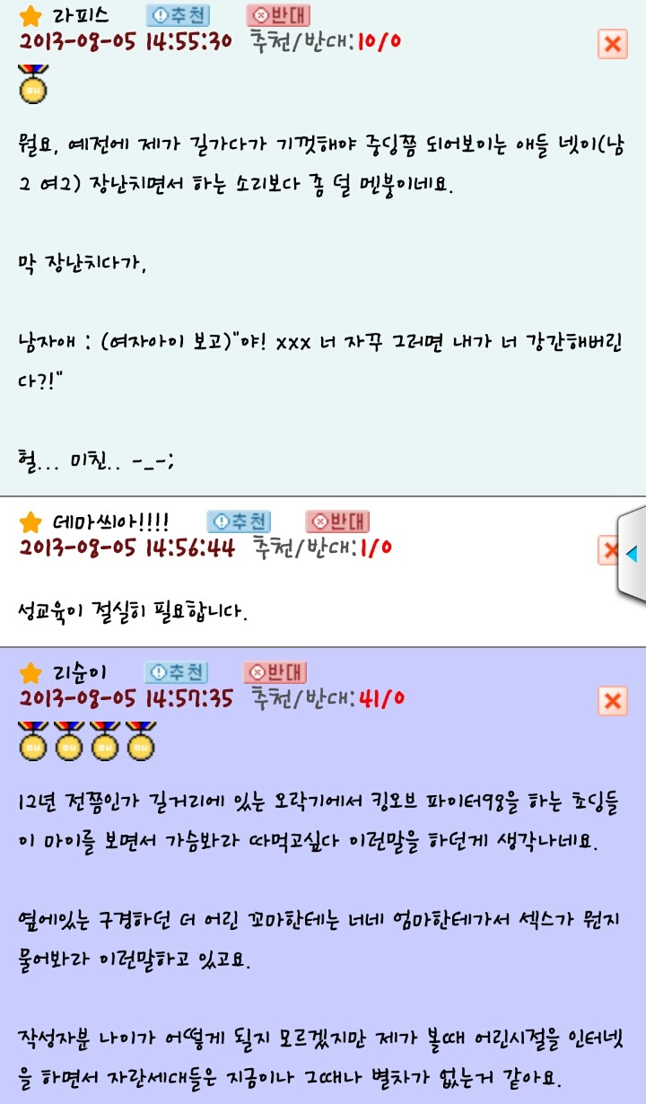 작성자모으리스 작성시간 14.03.30 나 고딩때 집가는길에 초등학교있는데 한 초3?초4? 정도 되보이는 남자애새끼들이 우루루 지나가면서 "야 보지다 보지~" 이럼 나랑 다른 모르는 여자애랑 걸어가고 있는데 이어폰 너머로 다들려서 미친새끼들 하고 씹었더니 졸졸쫓아오면서 계속 그럼 요새애들 애들이 아니야