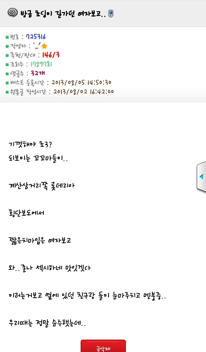 작성자Love myself 작성시간 14.03.30 나 밤에 집가는데 중딩애들이 뒤에서 싸이노래 부르길래 흥넘치네ㅋㅋㅋㅋ 하고가고 있는데 계속 왜 쌔끈해야 하는건지~ 그 부분만 계속 부르길래 찝찝해서 빨리 걸어갔는데 끝까지 쫓아왔었어 남사친 소환해서 구출됨 ...