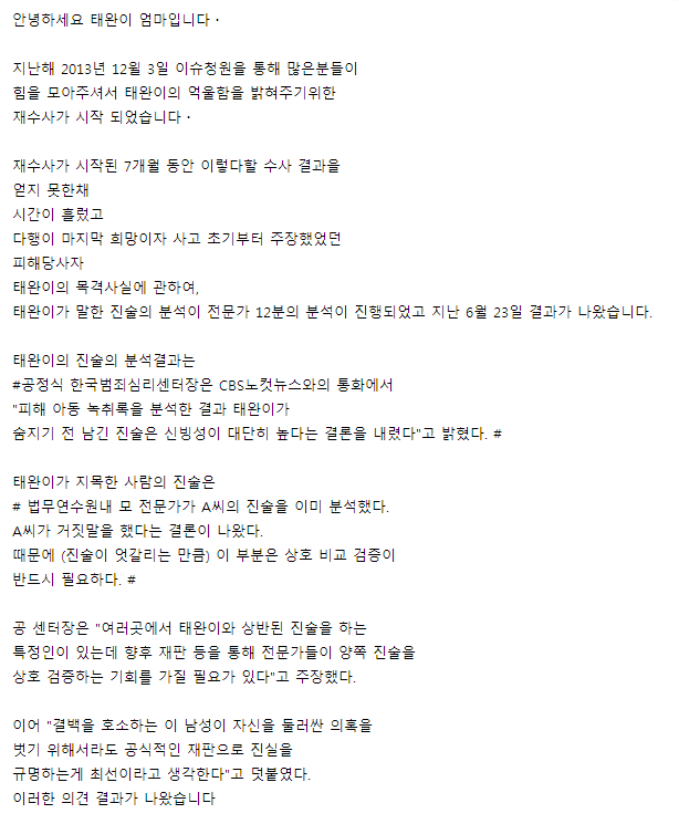 그러나 최근 재수사가 이루어 졌고 그 결과 태완이의 증언이 사실임이 밝혀졌다고 합니다.
