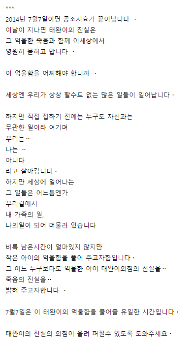 7월7일이면 황산테러로 세상을 떠난 태완이사건의 공소시효가 끝이납니다.
