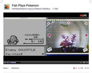 Hi everyone! Welcome to our stream where our fish, Grayson Hopper, plays a Pokemon game. Unfortunately, we don't have a dedicated light for Grayson at night as he lives in a tiny dorm room and we would rather not sleep with the light on. :( But in the future we will be getting him a dedicated lamp and improving the quality of the stream to include recent inputs determined by the motion tracking. Things can move a little slow, so another option we're considering is making the system distributed where we have a site where you can provide a fish stream link and we'll include it in the controlling.