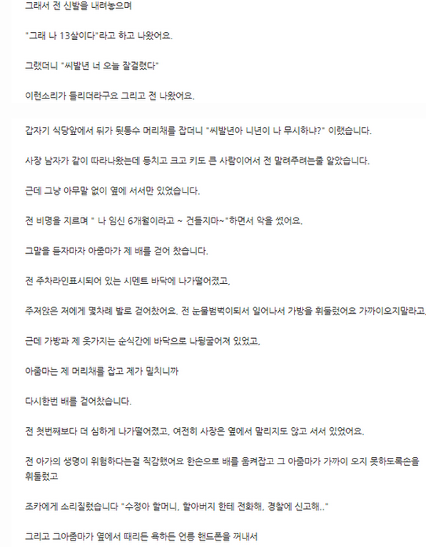 그말을 듣자마자 아줌마가 제 배를 걷어 찼습니다.
