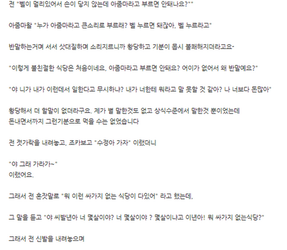 그 말을 듣고 "야 씨발년아 너 몇살이야? 너 몇살이야 ? 몇살이냐고 이년아! 뭐 싸가지 없는식당?"
