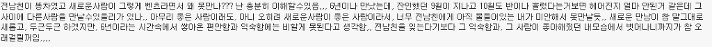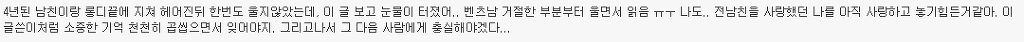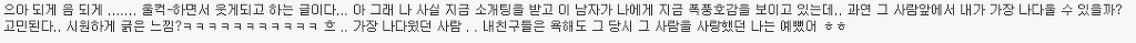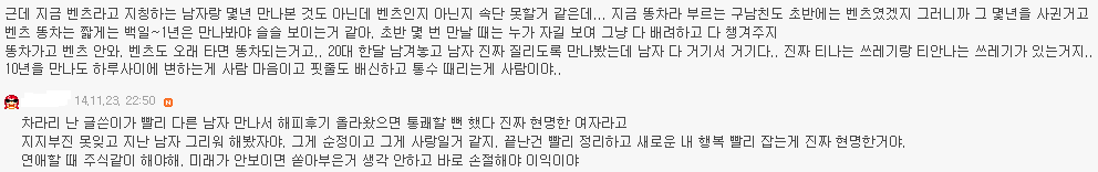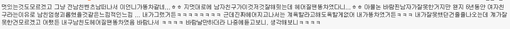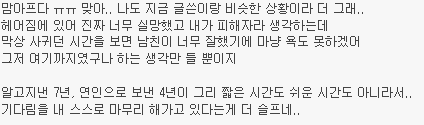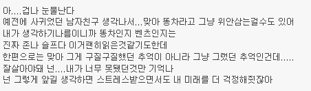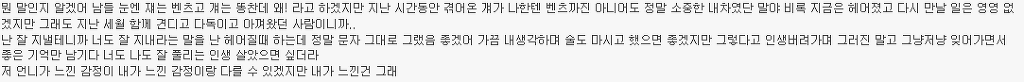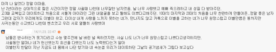 http://cafe.daum.net/subdued20club/ReHf/836037 위 주소가 '[네이트판]똥차가고 벤츠온다더니' 글이야! 혹시 모르는 여시들은 글주소 한번만 보고와도 좋아!!! 어제 '[네이트판]똥차가고 벤츠온다더니' 글을 올렸어. 글 내용은 6년사귄 글쓴이가 바람펴서 헤어진 전남친과 헤어지고 쓴 글인데 객관적으로 봤을때도 전남친보다 훨좋은 벤츠가 왔지만 받아주지않았다고 적은 글인데 꼭 한번 들어가서 직접 읽어 보길 추천해! 그 글을 읽고 여시들이 자신의 옛사랑에게 혹은 자신이 느끼는 사랑에 대한 댓글이 너무예뻐서, 먹먹해서 데리고왔어. 쩌리로 모아온다고 대댓은 달았는데 혹시 못본여시들을위해 익명처리했어. 제아무리 개똥차라도 6년이나 사귄거면 좋은점도 분명 있었을거고.... 마져 나 알겠다 정말 이마음. 날 너무 사랑했고 예뻐 죽으려하고 내 성질 다 받아주던. 10대의 마지막과 20대의 처음을 너무 찬란하게 만들어준..정말 좋은 남자 만나지도 않고 카톡으로 이별을 고하는 네가 너무 원망스럽고 이별만큼은 똥차지만 남들은 반수하는거 못기다리고 수능 몇주전에 날 버린 널 욕하겠지만, 사실 나도 너가 너무 원망스럽고 나쁘다고생각하지만. 근데 지금 벤츠라고 지칭하는 남자랑 몇년 만나본 것도 아닌데 벤츠인지 아닌지 속단 못할거 같은데... 지금 똥차라 부르는 구남친도 초반에는 벤츠였겠지 그러니까 그 몇년을 사귄거고 초반 몇 번 만날 때는 누가 자길 보여 그냥 다 배려하고 다 챙겨주지 20대 한달 남겨놓고 남자 진짜 질리도록 만나봤는데 남자 다 거기서 거기다.. 진짜 티나는 쓰레기랑 티안나는 쓰레기가 있는거지.. 차라리 난 글쓴이가 빨리 다른 남자 만나서 해피후기 올라왔으면 통쾌할 뻔 했다 진짜 현명한 여자라고 그게 순정이고 그게 사랑일거 같지. 끝난건 빨리 정리하고 새로운 내 행복 빨리 잡는게 진짜 현명한거야. 뭔 말인지 알겠어 남들 눈엔 쟤는 벤츠고 걔는 똥찬데 왜! 라고 하겠지만 지난 시간동안 겪어온 걔가 나한텐 벤츠까진 아니어도 정말 소중한 내차였단 말야 비록 지금은 헤어졌고 다시 만날 일은 영영 없겠지만 그래도 지난 세월 함께 견디고 다독이고 아껴왔던 사람이니까.. 가끔 내생각하며 술도 마시고 했으면 좋겠지만 그렇다고 인생버려가며 그러진 말고 그냥저냥 잊어가면서 좋은 기억만 남기다 너도 나도 잘 풀리는 인생 살았으면 싶더라 5년 사귀고 어제 헤어졌는데 공대남, 코찡찡이, 힐 등 공감되는부분이 많네... 나의 가장 순수햇던 시간들을 함께보낸 너에게 나는 너무도 잔인하게 헤어짐을 전할수밖에 없었다... 정말 미안하다.. 내 그자체를 사랑해주고 참아주고 기다려주고 5년내내 한결같이 예뻐해준 너를 떠난 내가 바보일수도있겠지.. 너에게 내가 똥차일수도 있겠지만 나는 너에게 5년동안 진실했고 가장 많이 후회없이 사랑했다. 주위사람들이 위로랍시고 더좋은사람 만날꺼야 하는 소리조차 듣기싫다. 진심으로 네가 좋은 여자 만나서 그 여자에게 많이 많이 사랑받고 지냈으면 좋겠어. 감기 조심하고 무릎도 관리 잘하고 많이 사랑했다 함께했던 시간 속엔 너만 있는게 아니라 너 옆에 있는 나도 있는 거니까. 너와의 시간을 부정해버리면 그 시간을 함께 보냈던 나 자신도 동시에 부정당하는 거니까. 똥차새끼였어, 떠올리고 싶지 않아, 하면서 기억 속에서 완전히 날려버리는 건 어차피 불가능하니까. 그냥 마치 학창시절 딱 한때만 친했었던 친구와의 기억을 가끔 상기시켜보듯 당시에 내가 사랑해 마지 않았던 너와의 기억들을 곱씹어보며 다시 웃어보면서 그렇게 그 기억들이 자연스럽게 저절로 희미해지길 바라는게 나에게도 더 좋은 이별법이 아닐까..! 이거 올초에 진짜 좋아했던 남자친구랑 헤어지고 후회하면서 많이봤었던 글인데 이렇게 또 보게되니까 새롭다 최근에 많이 힘들었었는데 어디서도 위로받지 못한 마음, 위로 받고 가네 나도 오늘, 그리고 내일, 또 먼 미래의 너를 응원해 아프지 않았으면 좋겠어 니가 날 떠났지만 넌 나의 가장 큰 위로였다 사랑했었어 내게 큰 상처를 주고 떠났지만 넌 정말 행복했으면 좋겠다 이런마음 평생 너한테 전할 수는 없겠지만 정말 행복해야해 공부하느라 집에 못가서 옷도 얇은거 밖에 없었잖아 밥은 잘 챙겨먹고 있어? 예매했다던 뮤지컬 보러는 갔니? 불쑥 나타나서 여전히 예뻐보이니까 그걸로 족하다고 했단말 들었어 그거 나한테 하는 말이라고 생각해도 되는거니 그냥 이런말이라도 했으면 했는데 니가 말없이 떠난데는 이유가 있을테니까 기회가 있었음에도 이 말을 전하지 못했어 진짜 공감 돼. 3년간 사귀며 기념일마다 선물해주고 데이트비용 내가 다 내면서 만났어도, 술 마실 때마다 꼬박꼬박 연락해주고 다른 여자 쳐다도 안보고 내가 읽고싶다던 책 찾느라고 동네 서점 다 뒤져가며 찾고 , 생일선물 대신 나 몰래 욕실까지 싹 청소해줬던 거, 둘다 돈 없을 때 자취방 바닥까지 까보면서 모은 백원짜리로 소주 한 병 사서 나눠먹던거ㅋㅋㅋ 정말 좋은 추억이었음. 어휴 너는 어쩌면 이리도 내 눈을 높여놔서 나를 힘들게 만드니! 멋있는것도 모르겠고 그냥 전남친벤츠남떠나서 이언니가똥차같네...ㅎㅎ
