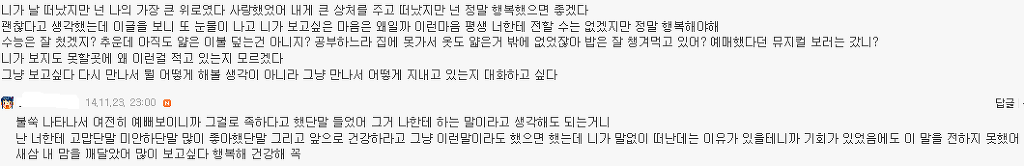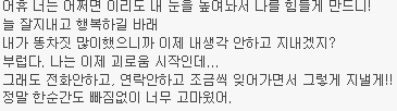 답댓글 작성자초코가달콤한시간 작성시간 14.11.25 보게된 글에서 알게되다니. 고생많았어. 그런 나를 상대하느냐. 표현이 서툴고 어떻게 거절해야 하는 지를 몰라 나에게 그랬던 거라고 이제야 조금은 이해가 되는거 같아. 그래도 그때 나는 잠시나마 행복했으니 괜찮은데 너는 어땠을까. 그래도 너 역시도 찰나의 행복을 느꼈을거라고 믿고 싶다. 끝까지 욕심부리네 나. 내 학창시절, 너를 제외하고 나니 남는게 없다ㅎㅎ 우리 참 오랜시간 동안 함께하며 서로에게 영향을 주고 있었구나