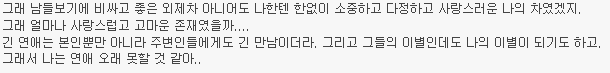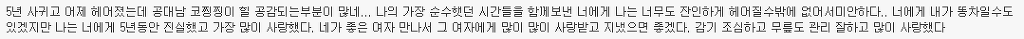 작성자다음생엔찬열같은남자로 작성시간 14.11.25 우린 그렇게 좋은 남자, 여자가 아니었지만.. 서로를 만나며 좋은 남자 여자가 되어가던 우리.. 결국 내가 그걸 먼저 깼고, 넌 그렇게 다른 사람이랑 만났지만. 이젠 원망안 해. 그럴만하더라.. 내가 널 어떻게든 나쁜놈으로 만들어야만 내가 조금 합리화되는 것 같았어. 미안해. 너도 알고 있었을텐데, 묻고 계속 노력해줘서 고마워. 예쁜 추억은 묻어두고 우리 각자 잘 살자!!