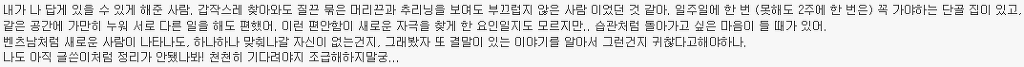 내가 주는 만큼 사랑받길 원했고 나를 아껴주길 바랐고 내 존재만으로 네가 행복했으면 좋겠다고 내가 너에게 주었던 것으로 느꼈던 감정들을 너도 그렇게 함으로써 느끼기를 강요하고 있었어.