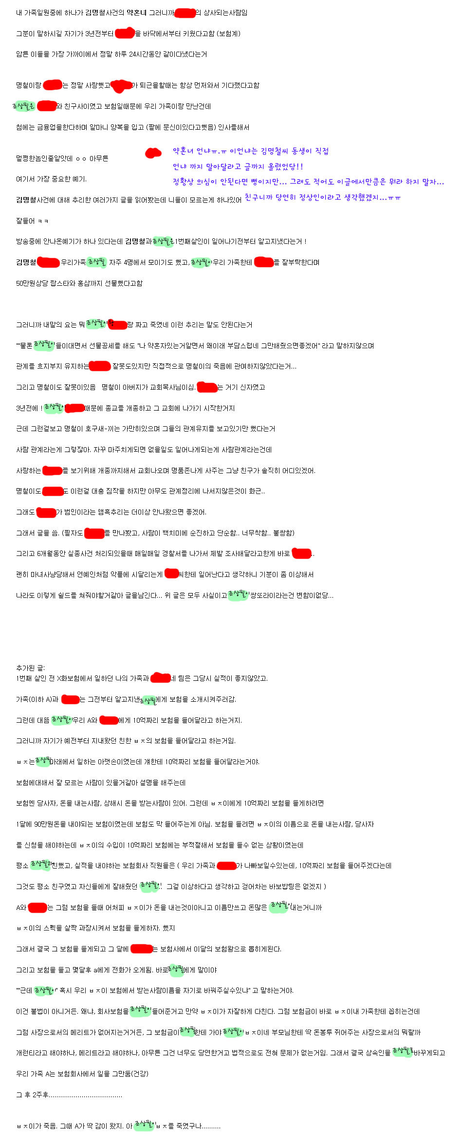 내가 봐도 의심스럽긴 하지만ㅠㅠ...... 그래도 이런글도 있고 위에 썼듯이 명철씨 가족들이 오히려 감싸주고 하니까