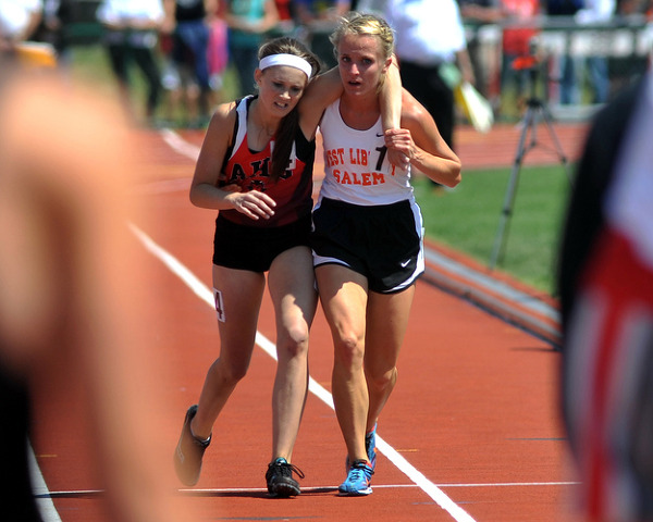 메건 보글양을 부축하여 피니쉬 라인으로 들어오는 아덴 맥매스양