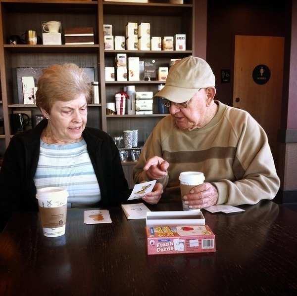 치매에 걸린 여자친구에서 알파벳을 가르켜주는 노인