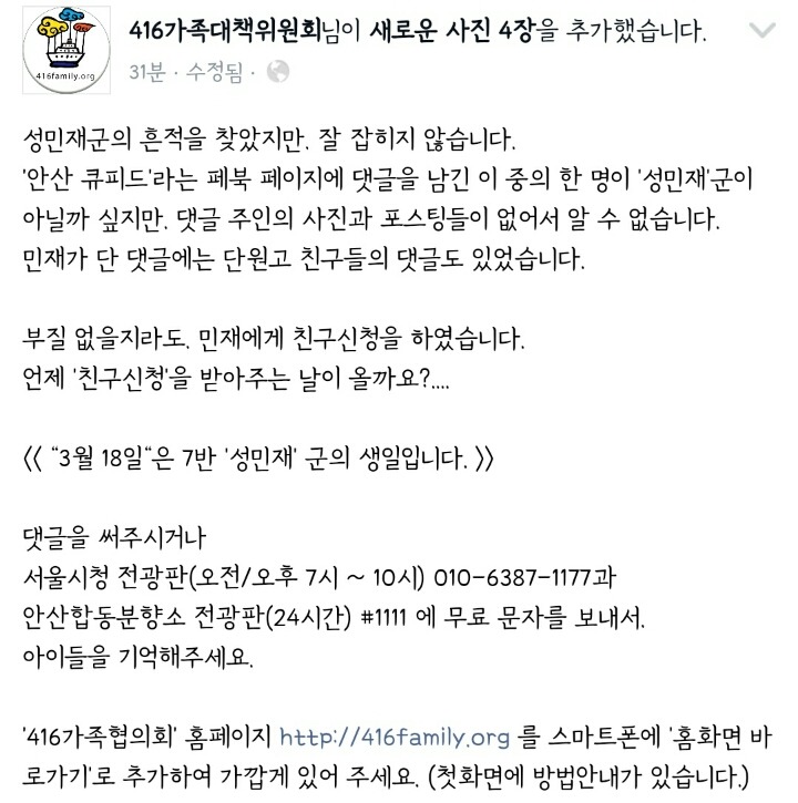 [눈물한방울]오늘자(3/18)생일인 친구;) #1111 세월호 안산합동분향소 전광판으로 문자보내주세요. 작성자꽃같은 아이들이 꽃잎되어 사라졌다|작성시간15.03.18|조회수2,607 목록 댓글 58 글자크기 작게가 글자크기 크게가 출처 416가족대책위 페이스북 다음검색 현재 게시글 추가 기능 열기 북마크 공유하기 신고 센터로 신고 댓글 댓글 58 댓글쓰기 답글쓰기 댓글 리스트 작성자너승호 | 작성시간 15.03.18 문자 보냈어 잊고 있었는데 이제 계속 기억할게 작성자경수경수우리도경수 | 작성시간 15.03.18 민재야 생일 축하해! 잘 지내고 있지? 누나 너 절대 안 잊을께 생일 너무 축하해! 사랑해! 작성자나도응원좀해주지 | 작성시간 15.03.18 여시야 이렇게 글 올려줘서 고마워! 문자보냈당 작성자니리리리닉 | 작성시간 15.03.18 민재야 생일축하해!!!! 작성자어디세훈 | 작성시간 15.03.18 여시 덕분에 보냈어♥ 항상 고마워! 댓글 전체보기