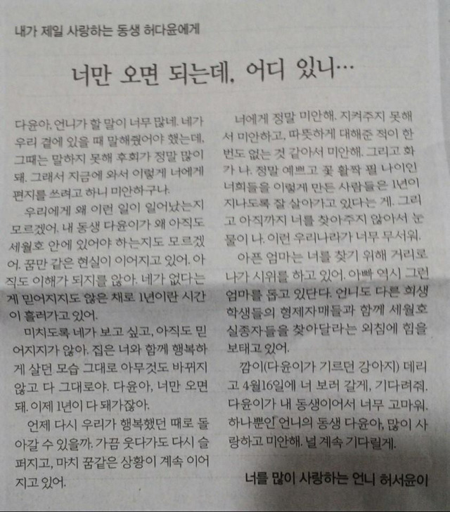 세월호 실종자 다윤 양 언니가 쓴 편지...