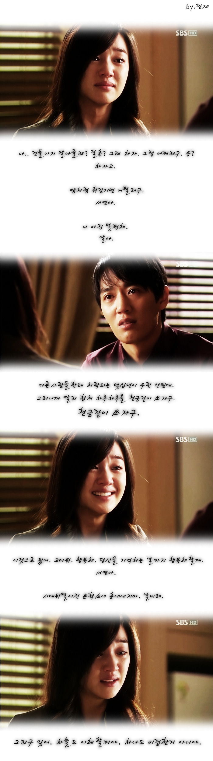 작성자한번이라도 너를 쉰적이 없어 작성시간 15.04.27 천일의 약속이 김수현작가 작품이지? 아 진짜 저거 둘다봤지만 둘다 명작이야................... 두 작품 다 주인공들이 연기 너무 잘했고ㅠㅠ 천일의약속은 특히 저 대사들...ㅠㅠ