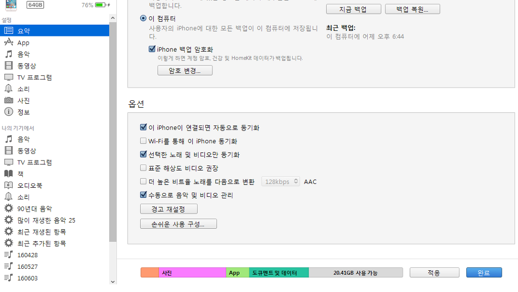 근데 애기는 아이팟쓸때도 노래 수동으로 관리했어서 이번에도 아무생각없이 수동으로 관리에 체크를 딱!하고 적용을 눌렀는데