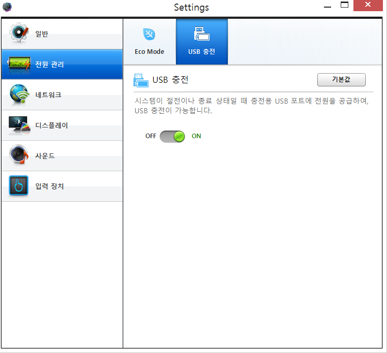 그림처럼 전원관리 - USB충전 - ON으로 바꿔줌.