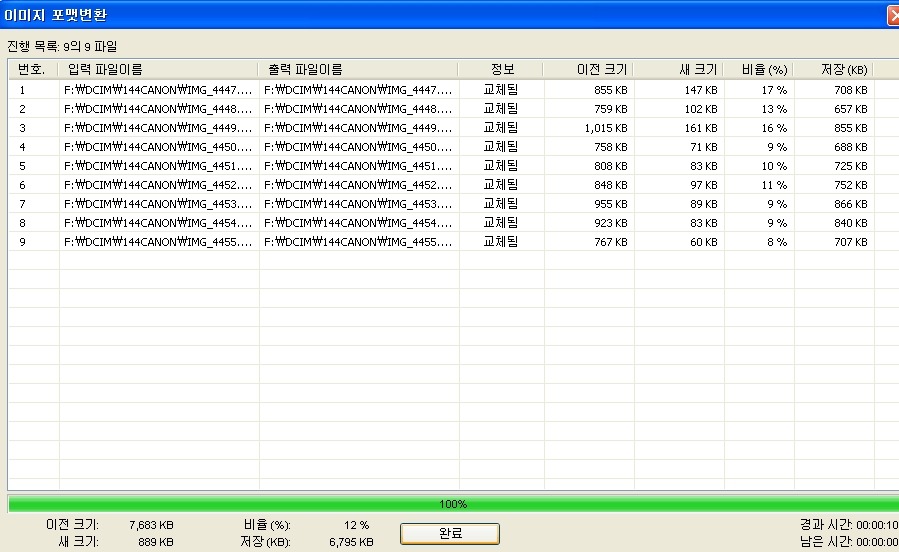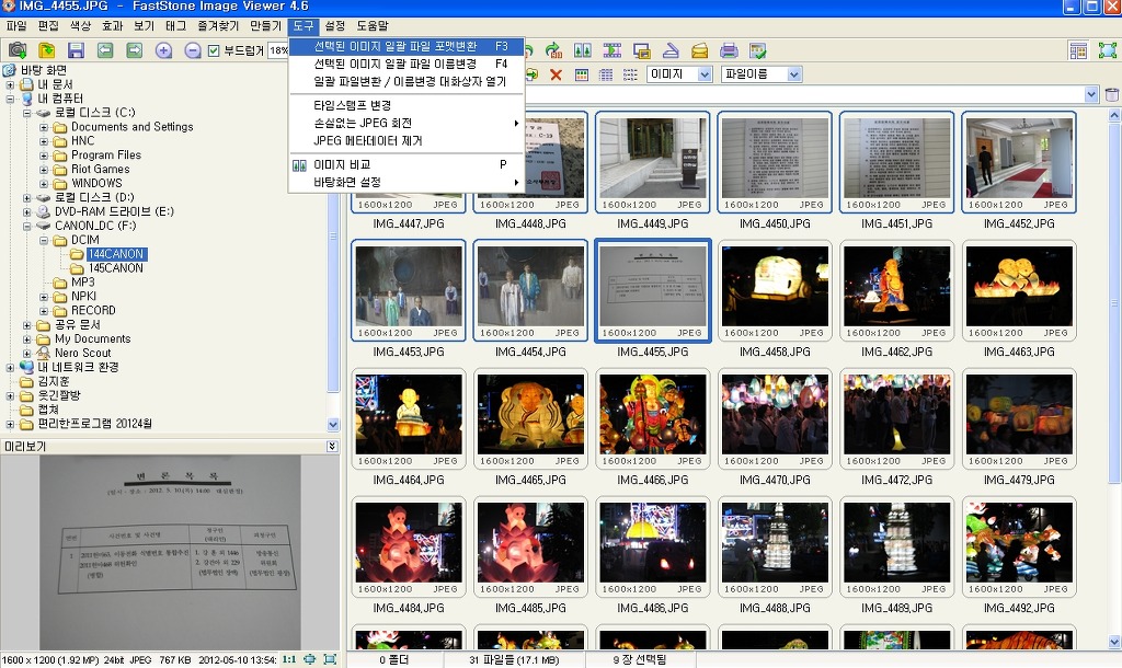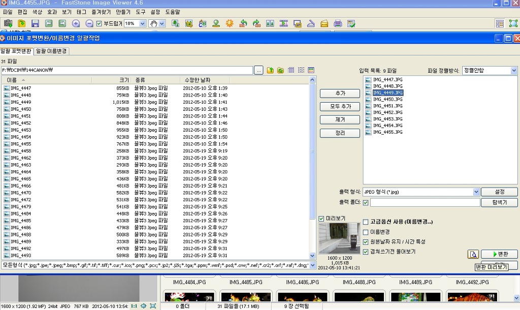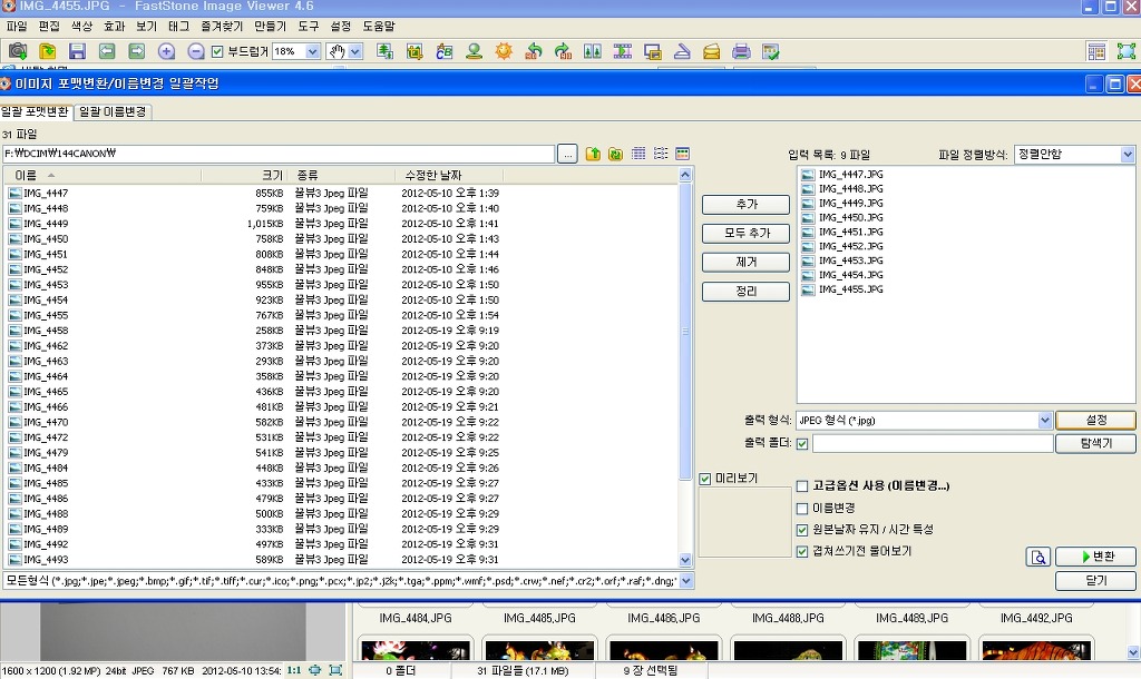 대상 파일들을 클릭하고 F3을 누르거나 도구- 선택된 이미지 일괄 파일 포맷을 누름ㅋ