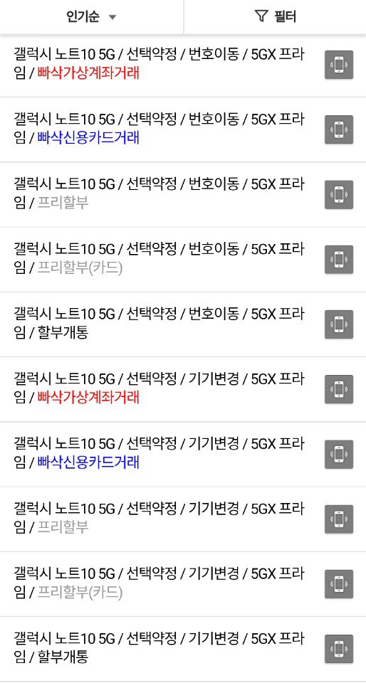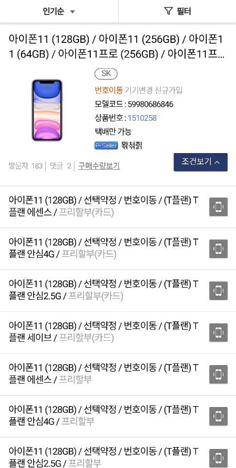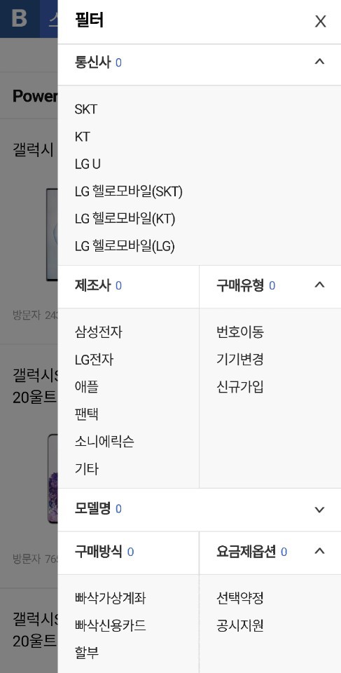 예시) 내가 지금 sk 인데 kt로 갤럭시를 사고 싶다 > 통신사 kt, 제조사 삼성전자, 구매유형 번호이동 이렇게 설정하면됨