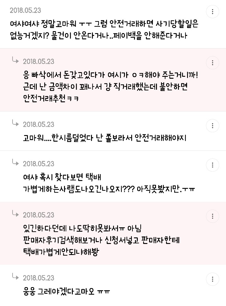현완 안전거래는 여시들이 아는 안전거래처럼 빠삭이 중간에 껴서 돈을 맡아뒀다가 여시가 물건 무사히받은다음 받았다하면 빠삭이 판매자한테 돈주는건데 수수료때문에 직거래랑 징이 몇만원정도 차이나!