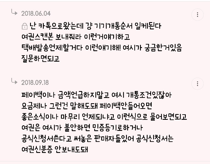 여시가 살거 고르면 정보작성창 뜨는데 거기서 개통관련 정보작성하면 판매자쪽에서 카톡이나 전화등으로 연락이와 근데 연락할때 페이백30맞죠? 등등 거래내용관련된거 언급금지 언급하면 거래취소임