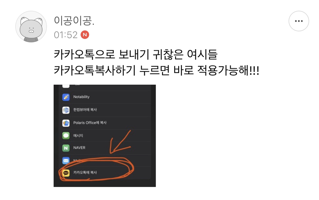 작성자밥또 작성시간 20.03.12 카카오톡으로 복사 이게 안 떠서 답답해죽는줄 ㅠㅠ 여샤 고마웡!!!!