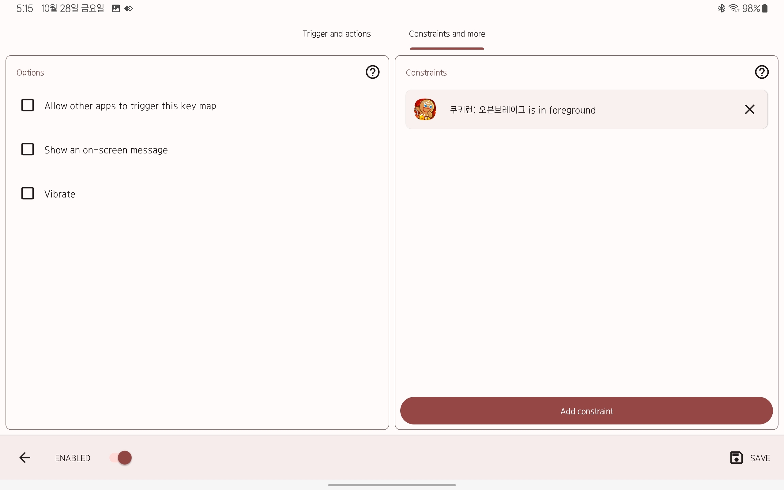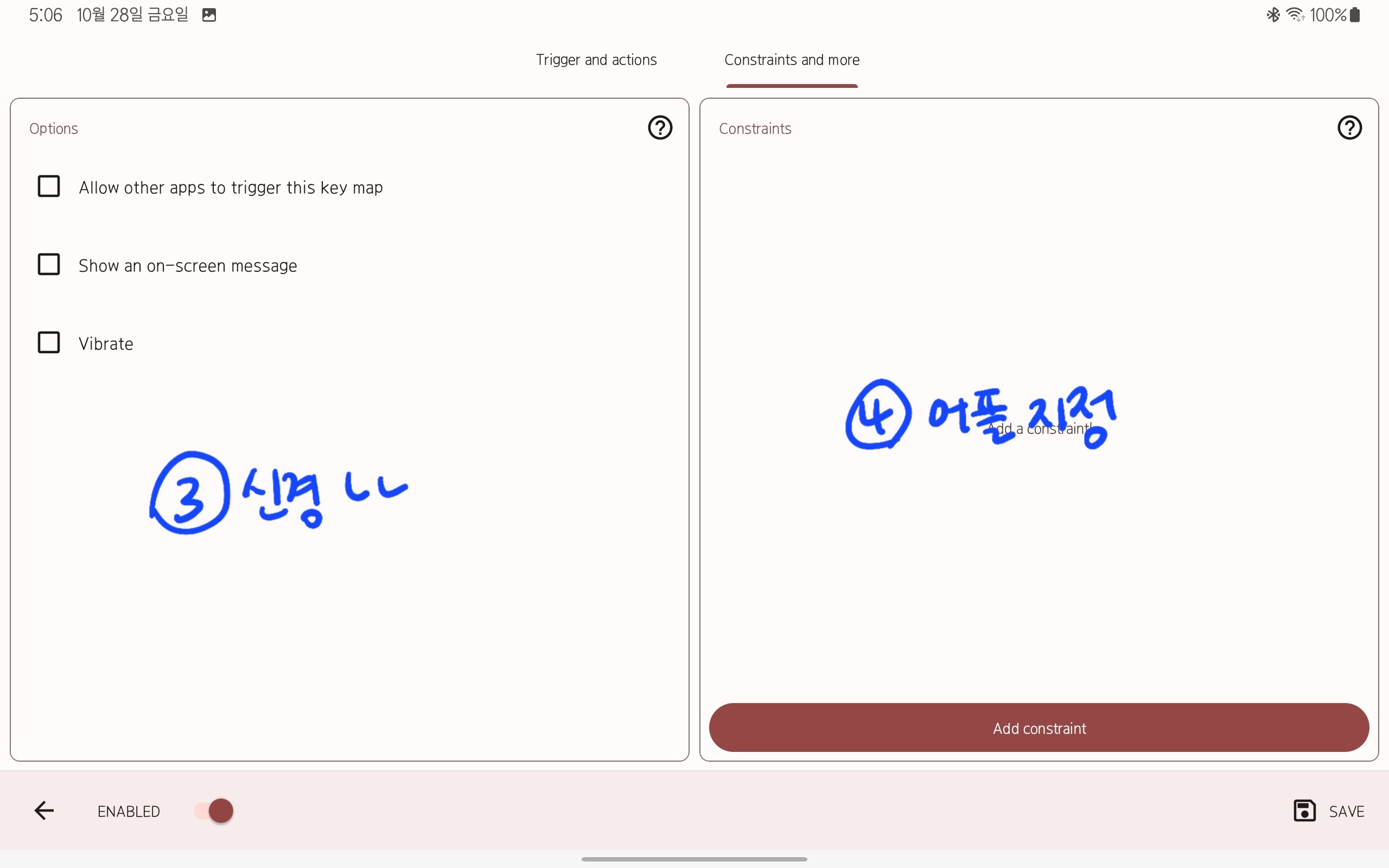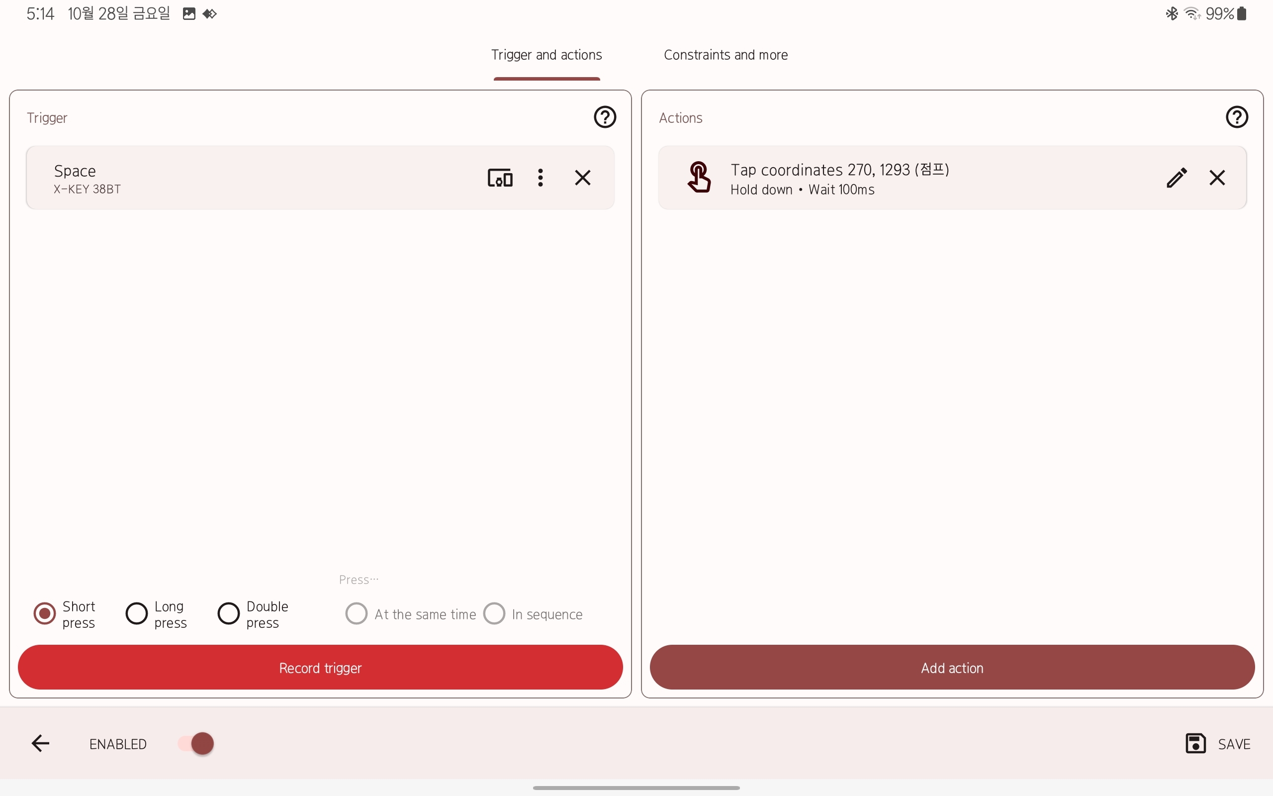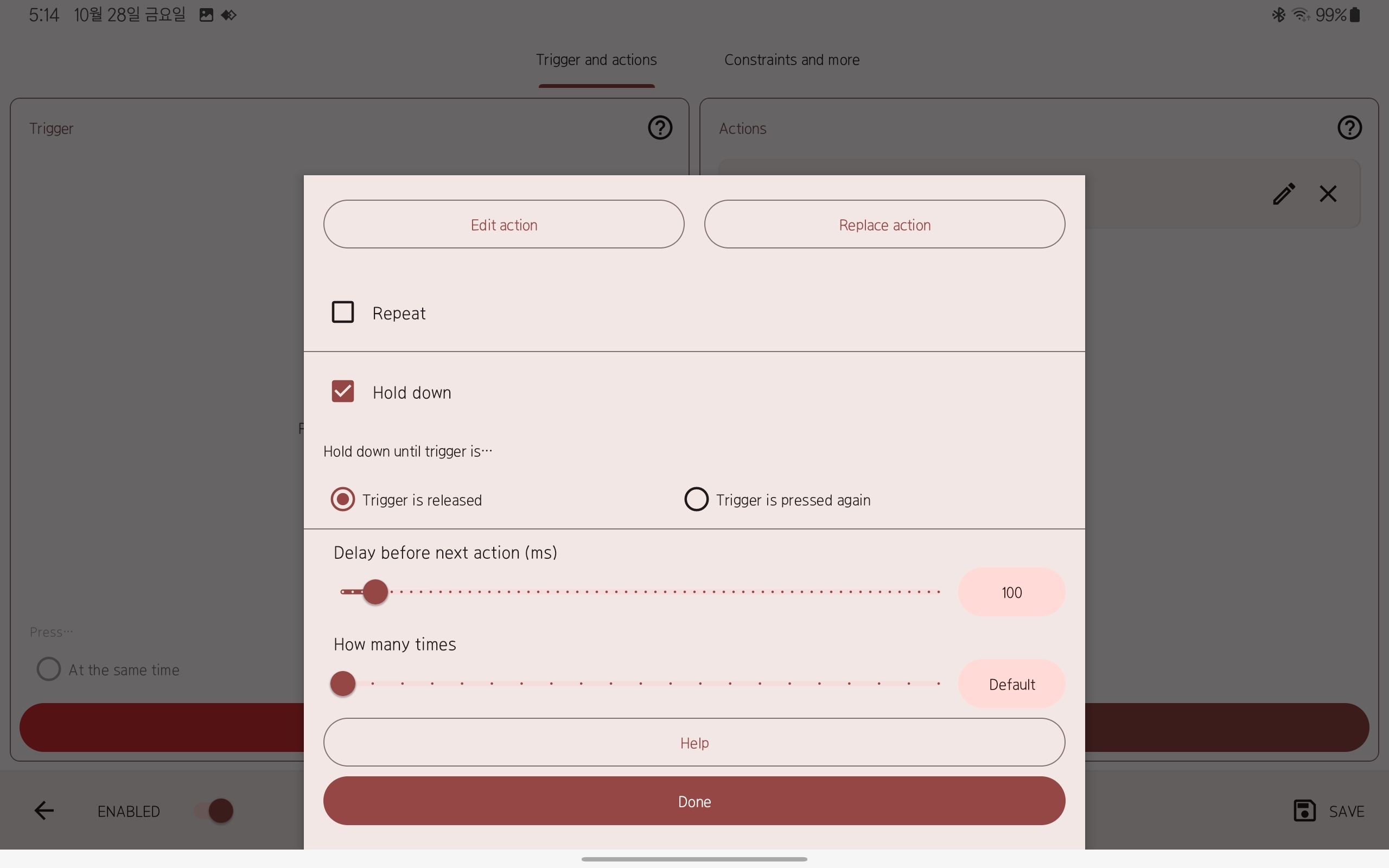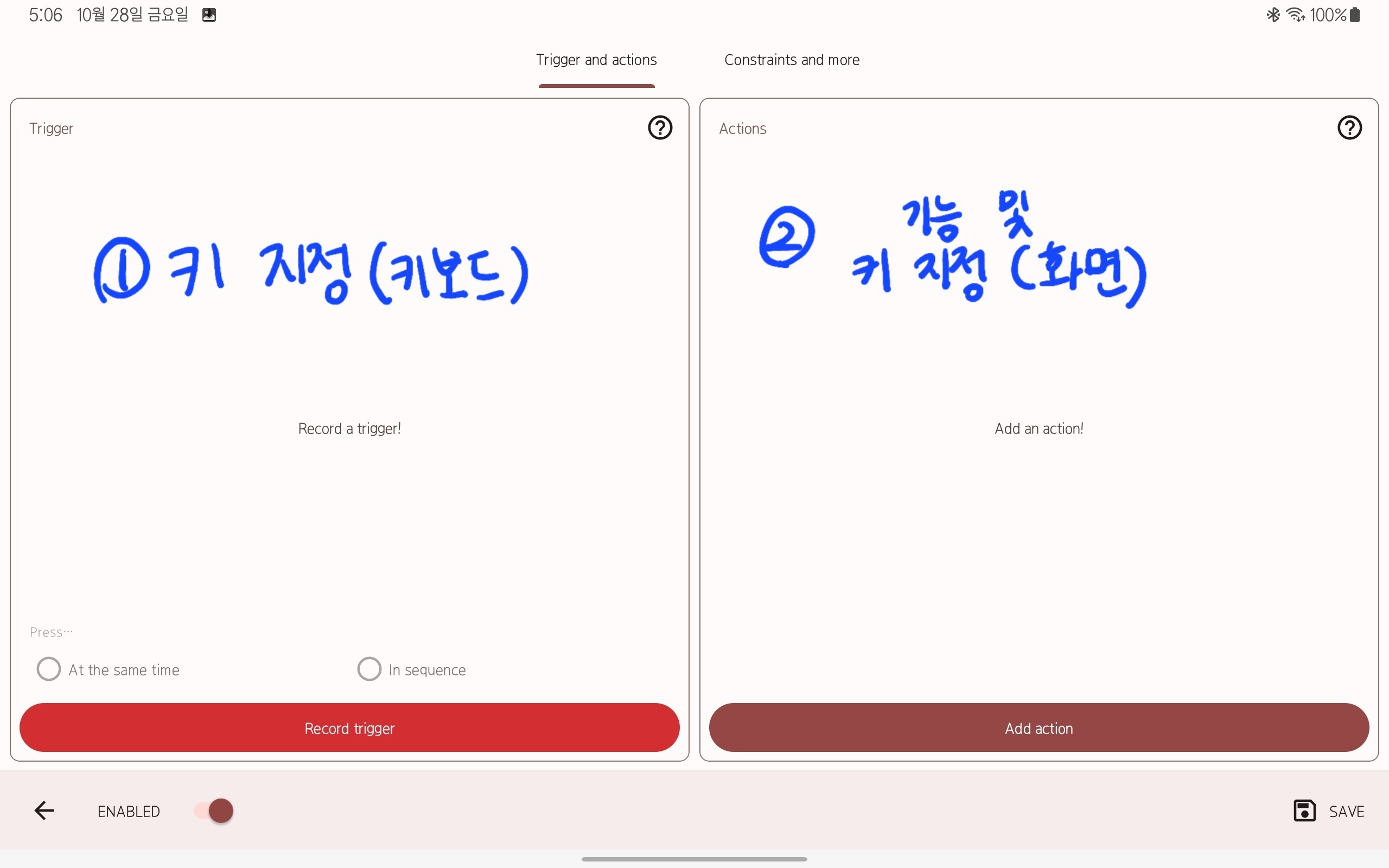 그럼 오른쪽처럼 hold down 웅앵 써져있을거야 그럼 record trigger를 눌러서 내가 누르고 싶은 키를 키보드에서 누르면 돼