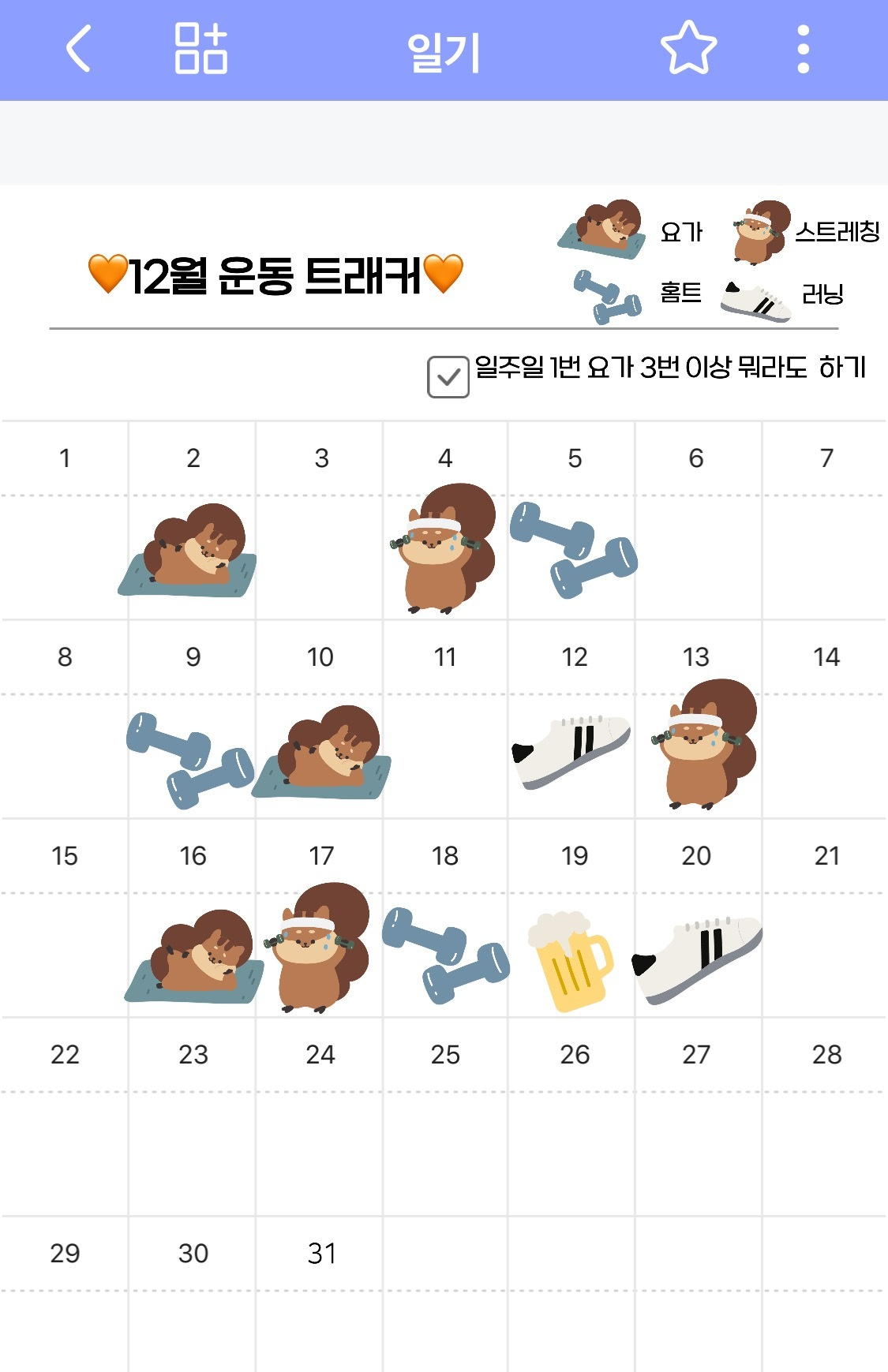 제가 주로 사용하는 먼슬리 트래커.. 목표했던 운동량 달성 여부를 챙기면서 망한 운동 내역도 기록중 ㅋㅋㅋ