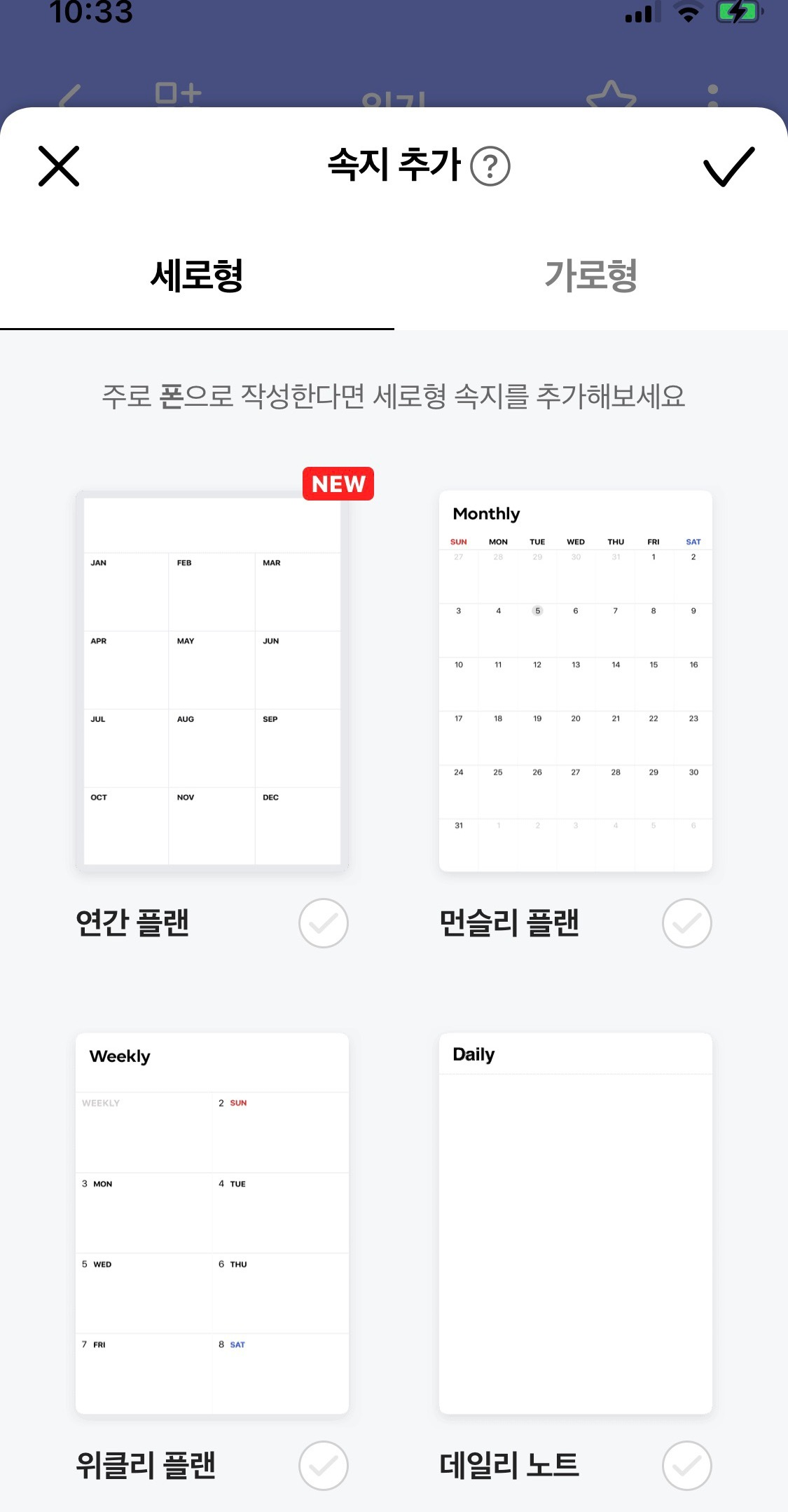 10 종류의 속지 모두 모바일에 적합한 세로 버전이랑 아이패드에 맞는 가로 버전으로 속지가 두 종류씩 있어.
