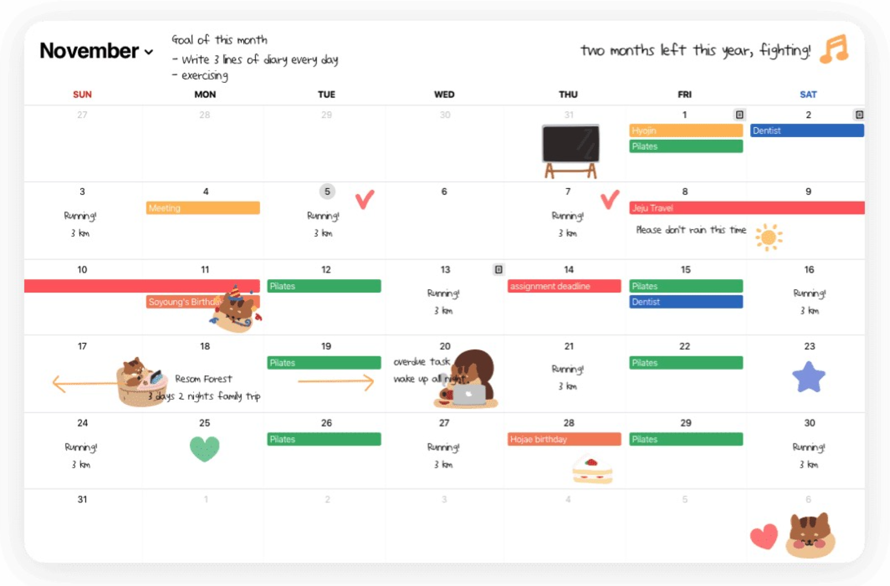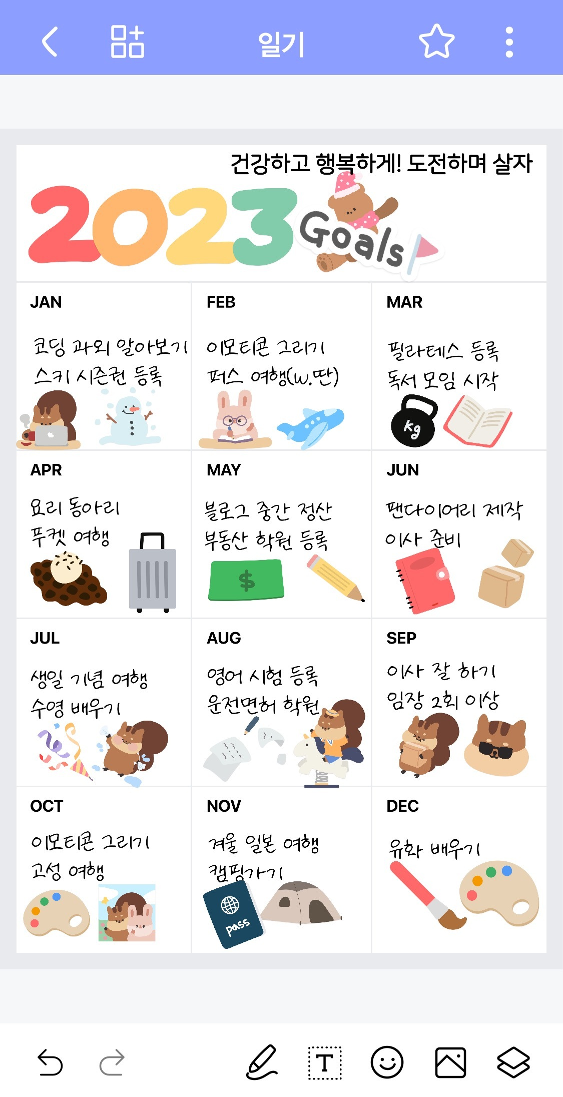 심플하게 텍스트만 넣은 내 1년 계획표를 스티커로 귀염뽀짝하게 꾸며봤어. 나름 귀엽지?