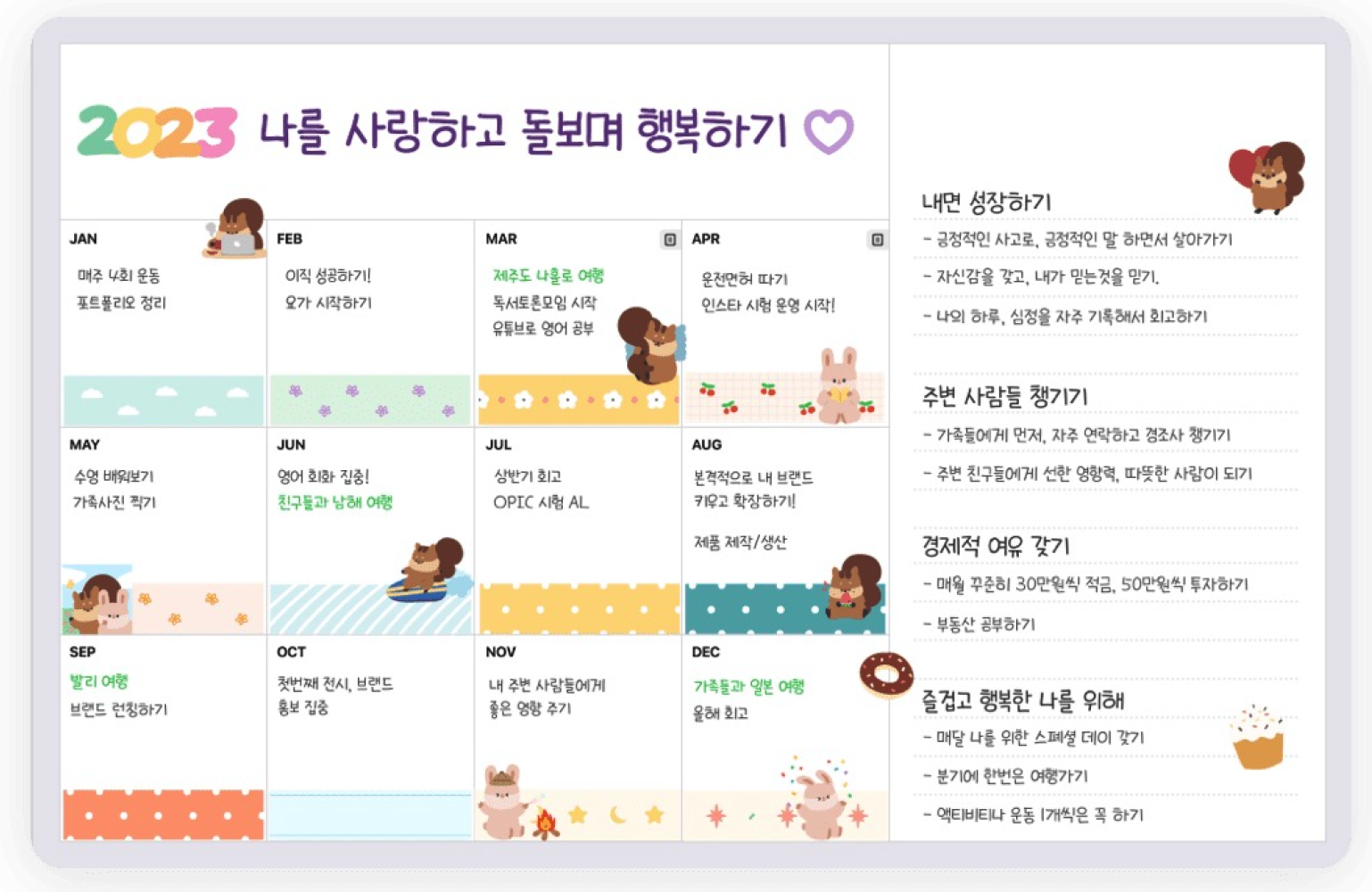 얼마나 지킬 지 모르겠지만, 1년의 목표를 정리해서 세울 수 있어서 한 눈에 볼 수 있어.