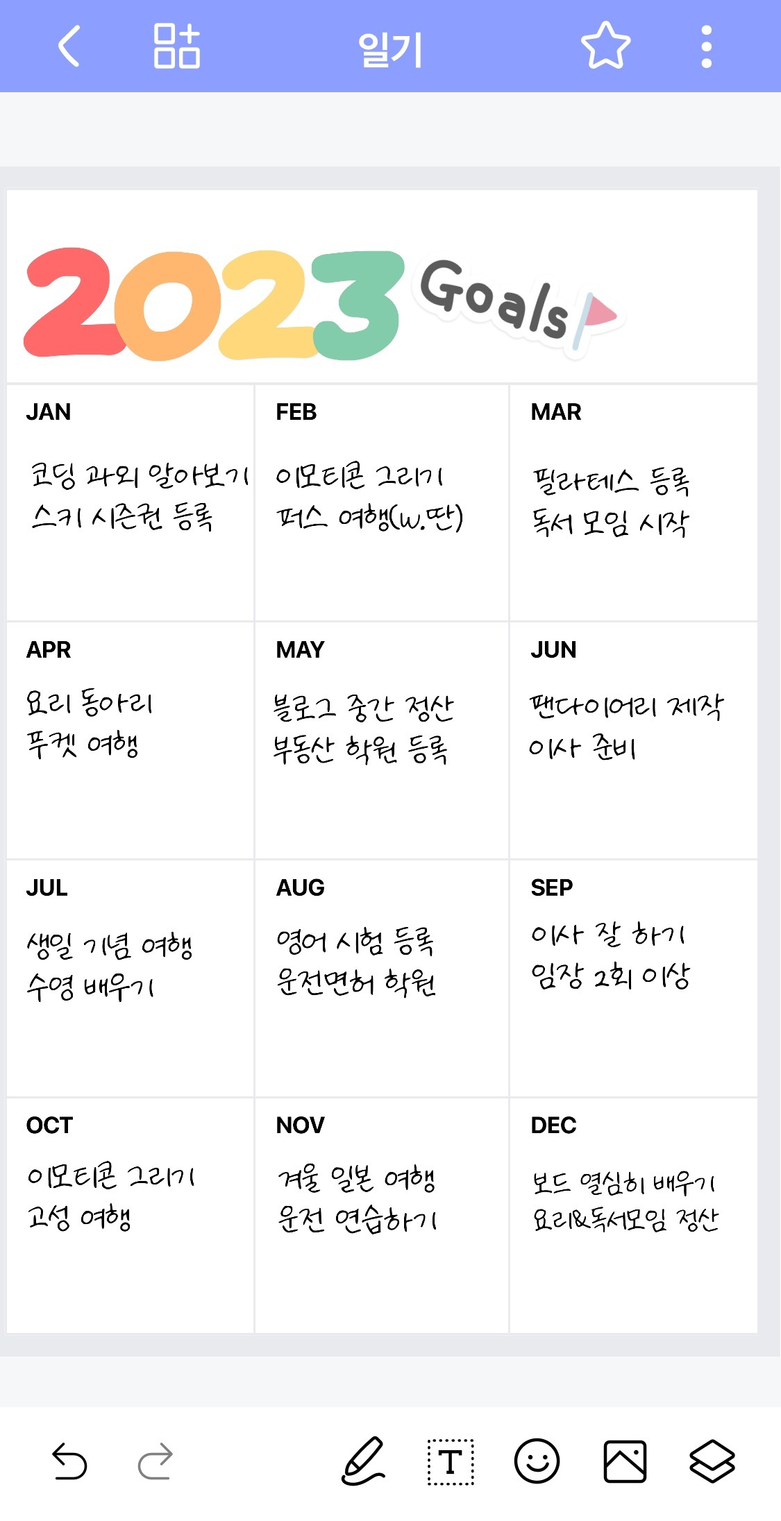 요새 내가 잘 쓰고 있는 다이어리앱이 하나 있는데, 꾸미는 맛도 있고 속지도 새해 계획 쓰기 좋은 것 같아서 잘 쓰고 있거든 (나 똥손이지만.. )