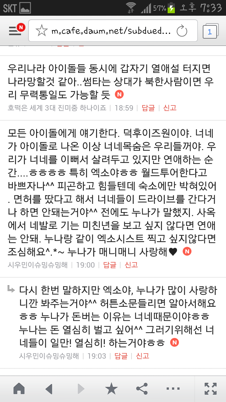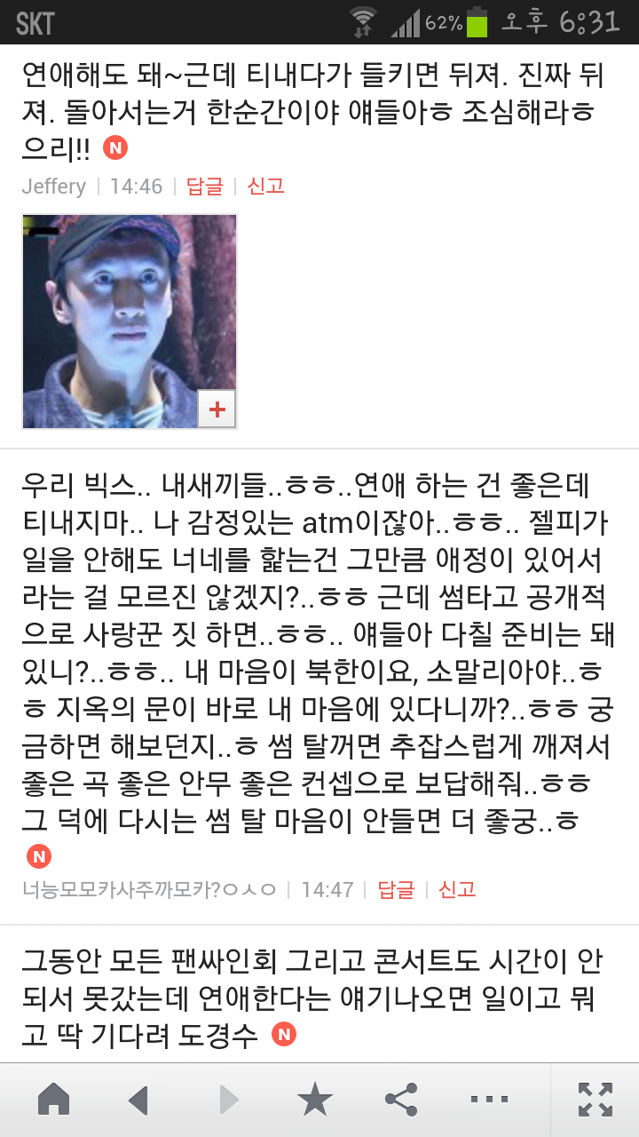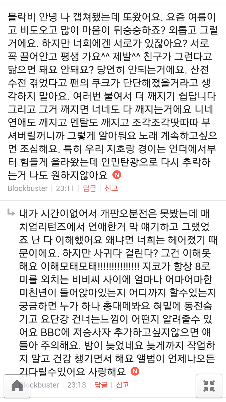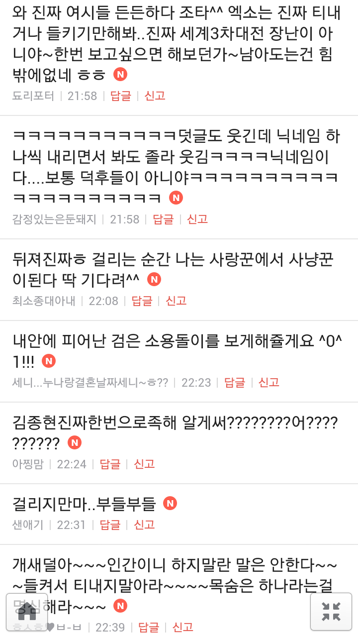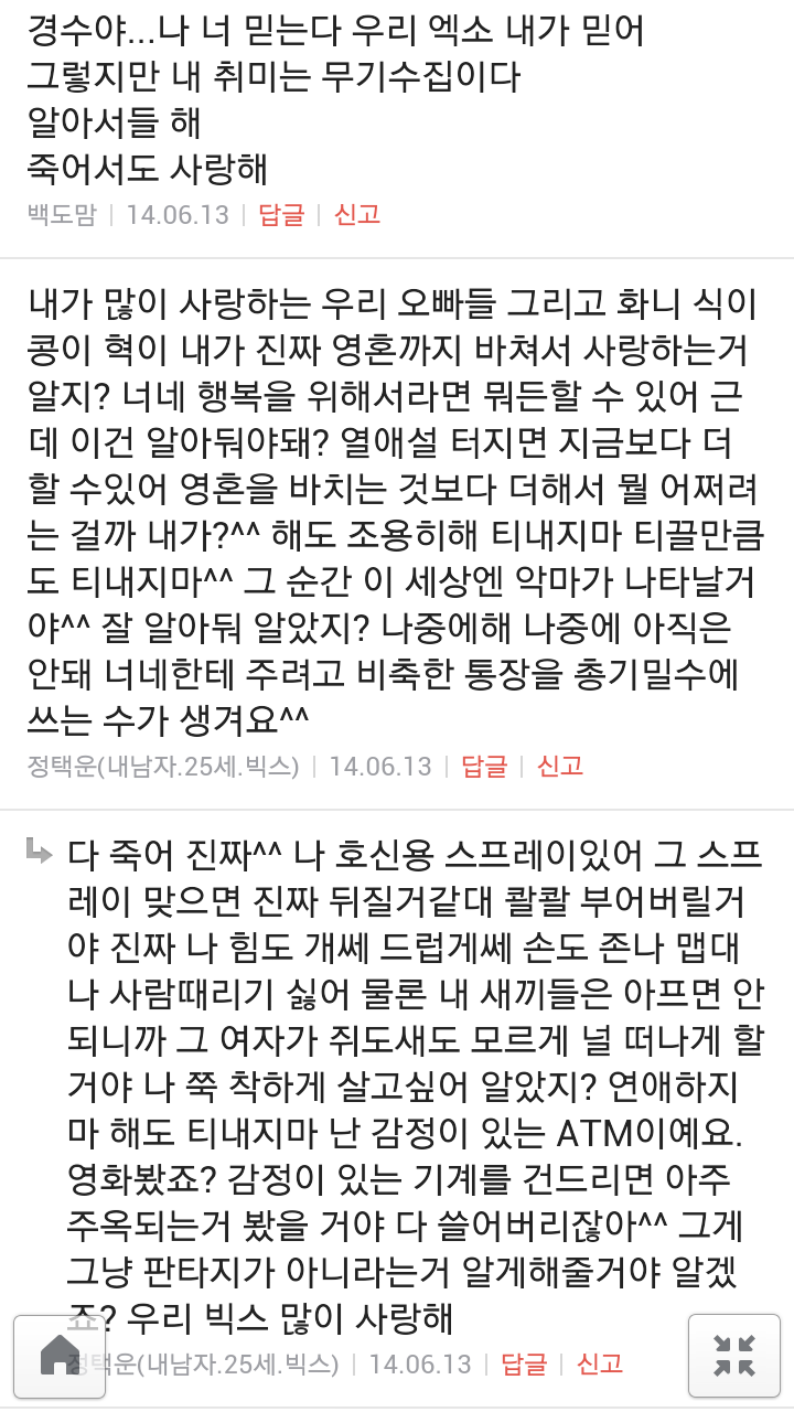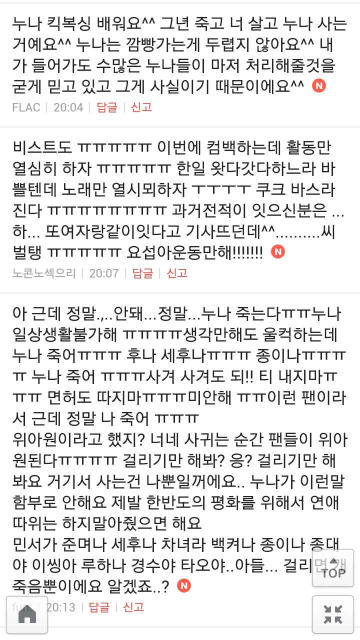 [여시캡쳐]아이돌 공개연애 다메요 (팬여시 리플 마지막 ver.) 작성자좋은집주인|작성시간14.06.11|조회수13,730 목록 댓글 87 글자크기 작게가 글자크기 크게가 출처 : 여성시대 좋은집주인 다음검색 현재 게시글 추가 기능 열기 북마크 공유하기 신고 센터로 신고 댓글 댓글 87 댓글쓰기 답글쓰기 댓글 리스트 작성자유일운 | 작성시간 14.06.19 구경와따 ㅇㅅㅇ... 작성자코민코민하짐마 | 작성시간 14.06.20 하하하하ㅏㅏㅏ하하하하하ㅏ하ㅏ.................. 작성자BTD (베이컨토마토디럭스) | 작성시간 14.06.21 Aㅏ.........ㅎ... 작성자계피덕후 | 작성시간 14.06.22 다시 생각나서 왔어...청계천갈까봐 작성자중독[overdose] | 작성시간 14.06.25 ㅋㅋㅋㅋ.......시발 댓글 전체보기