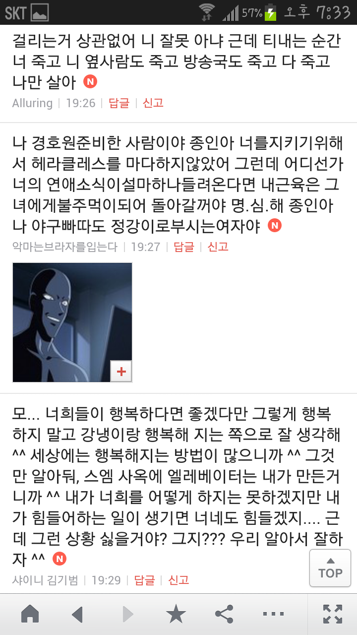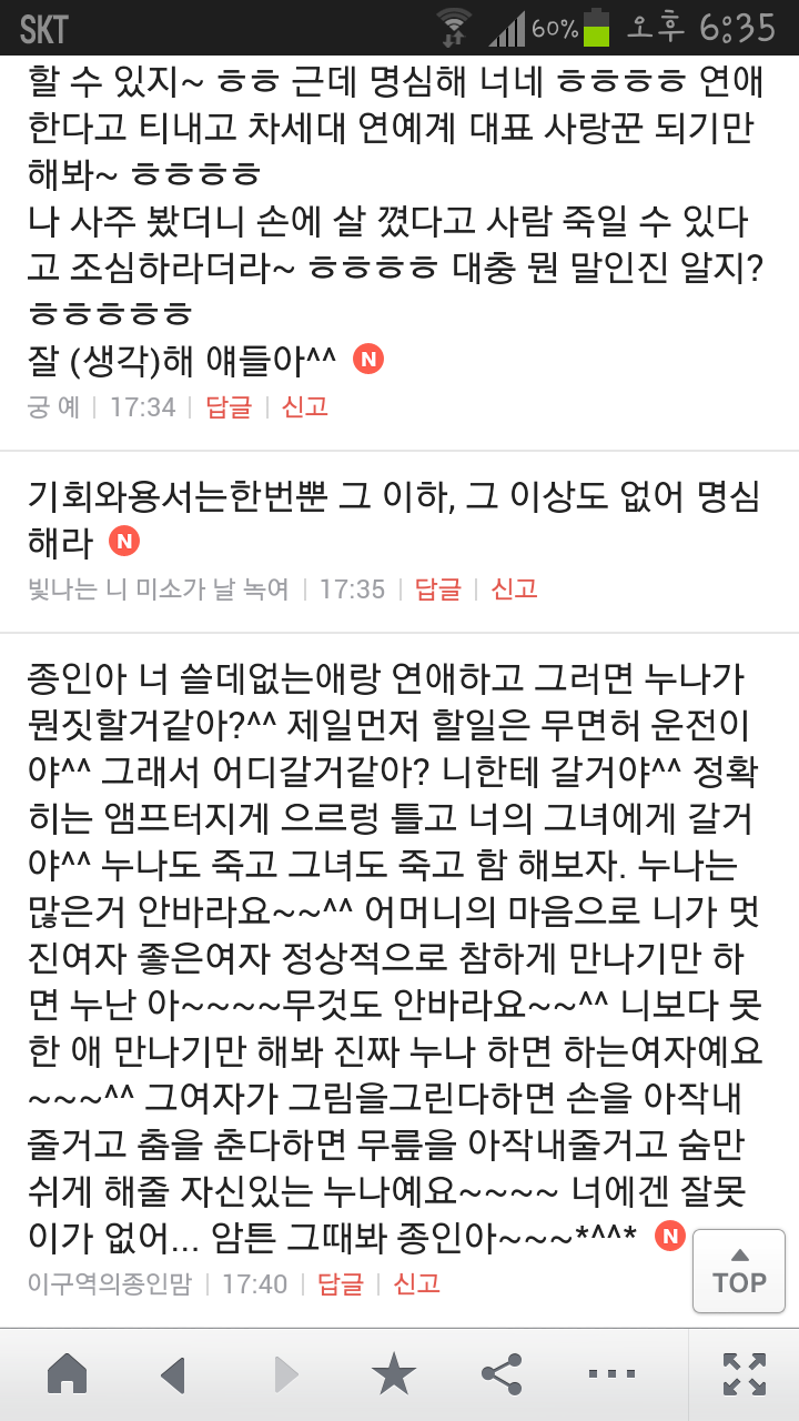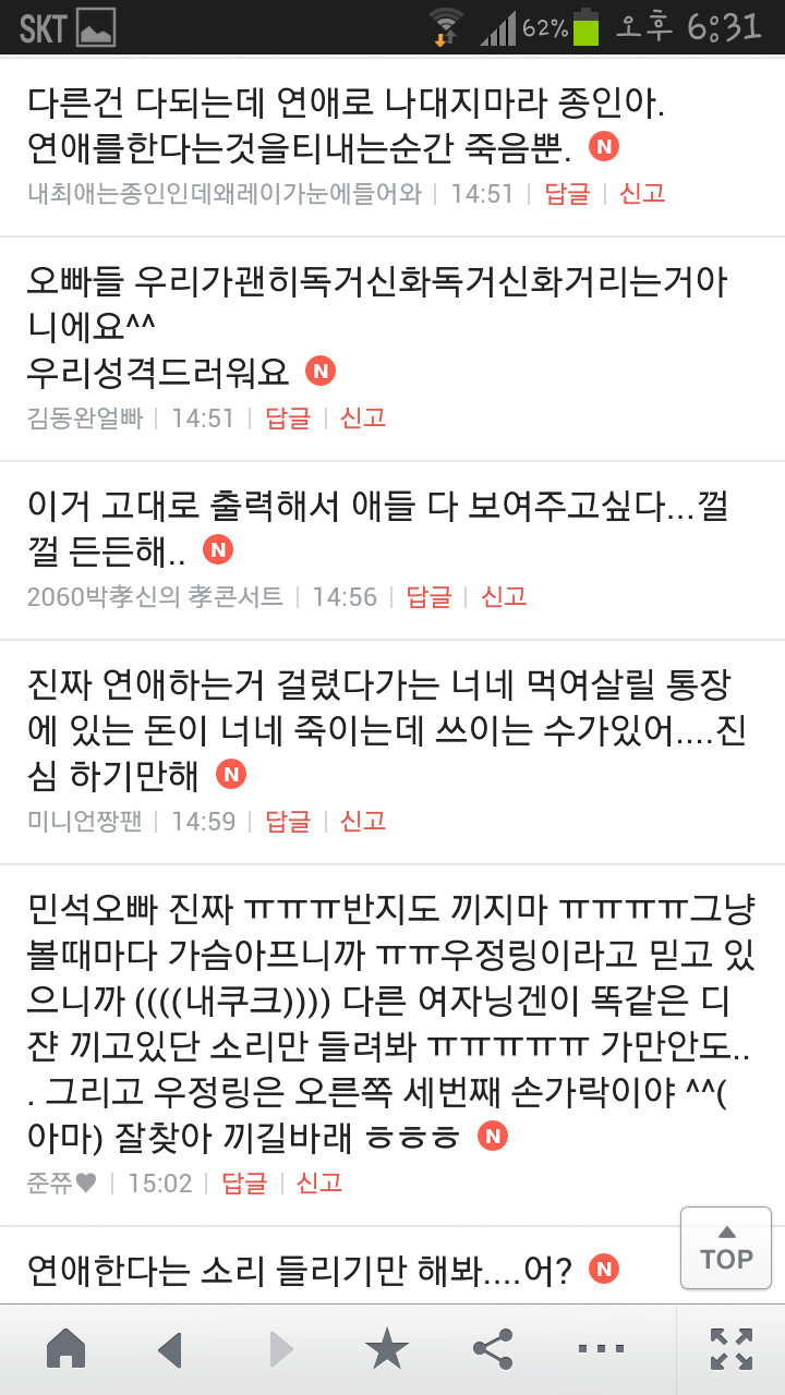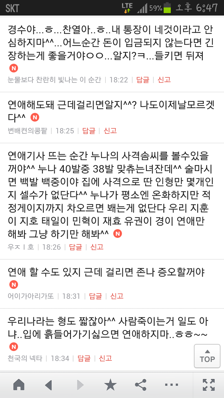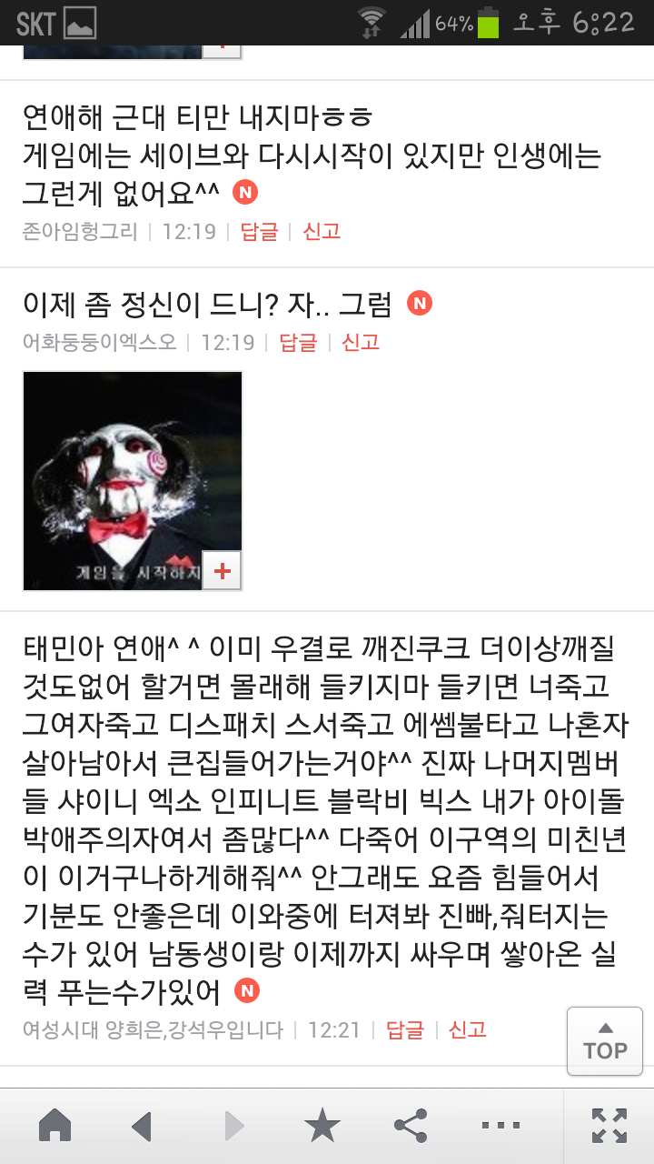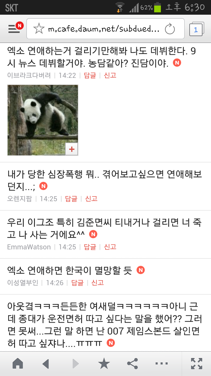 [여시캡쳐]아이돌 공개연애 다메요 (팬여시 리플 마지막 ver.) 작성자좋은집주인|작성시간14.06.11|조회수13,730 목록 댓글 87 글자크기 작게가 글자크기 크게가 출처 : 여성시대 좋은집주인 다음검색 현재 게시글 추가 기능 열기 북마크 공유하기 신고 센터로 신고 댓글 댓글 87 댓글쓰기 답글쓰기 댓글 리스트 작성자유일운 | 작성시간 14.06.19 구경와따 ㅇㅅㅇ... 작성자코민코민하짐마 | 작성시간 14.06.20 하하하하ㅏㅏㅏ하하하하하ㅏ하ㅏ.................. 작성자BTD (베이컨토마토디럭스) | 작성시간 14.06.21 Aㅏ.........ㅎ... 작성자계피덕후 | 작성시간 14.06.22 다시 생각나서 왔어...청계천갈까봐 작성자중독[overdose] | 작성시간 14.06.25 ㅋㅋㅋㅋ.......시발 댓글 전체보기